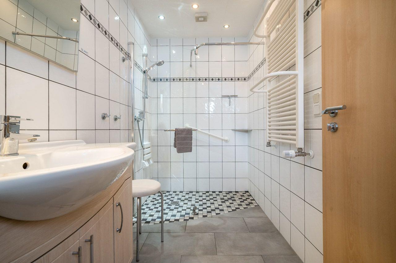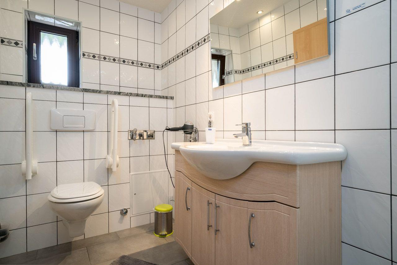 Die Fewo mit 2 Schlafzimmern verfügt ebenfalls über ein barrierefreies Bad mit ebenerdiger Dusche, Haltegriffen und erhöhtem WC für Gäste mit eingeschränkter Mobilität. Die offene Wohnküche ist voll ausgestattet und das gemütliche Wohnzimmer lädt zum Entspannen ein. Die breiten Türen und Rampen für die Außenstufen sorgen für zusätzlichen Komfort.