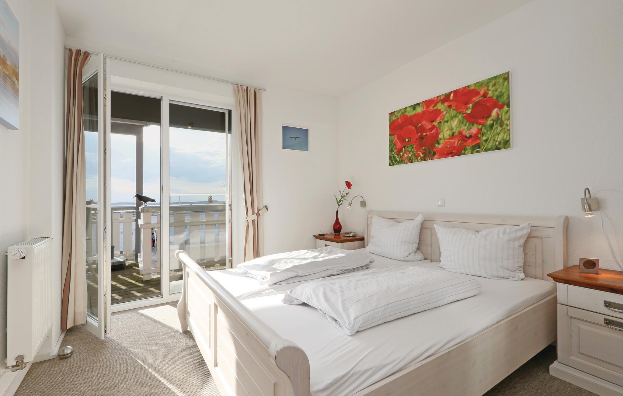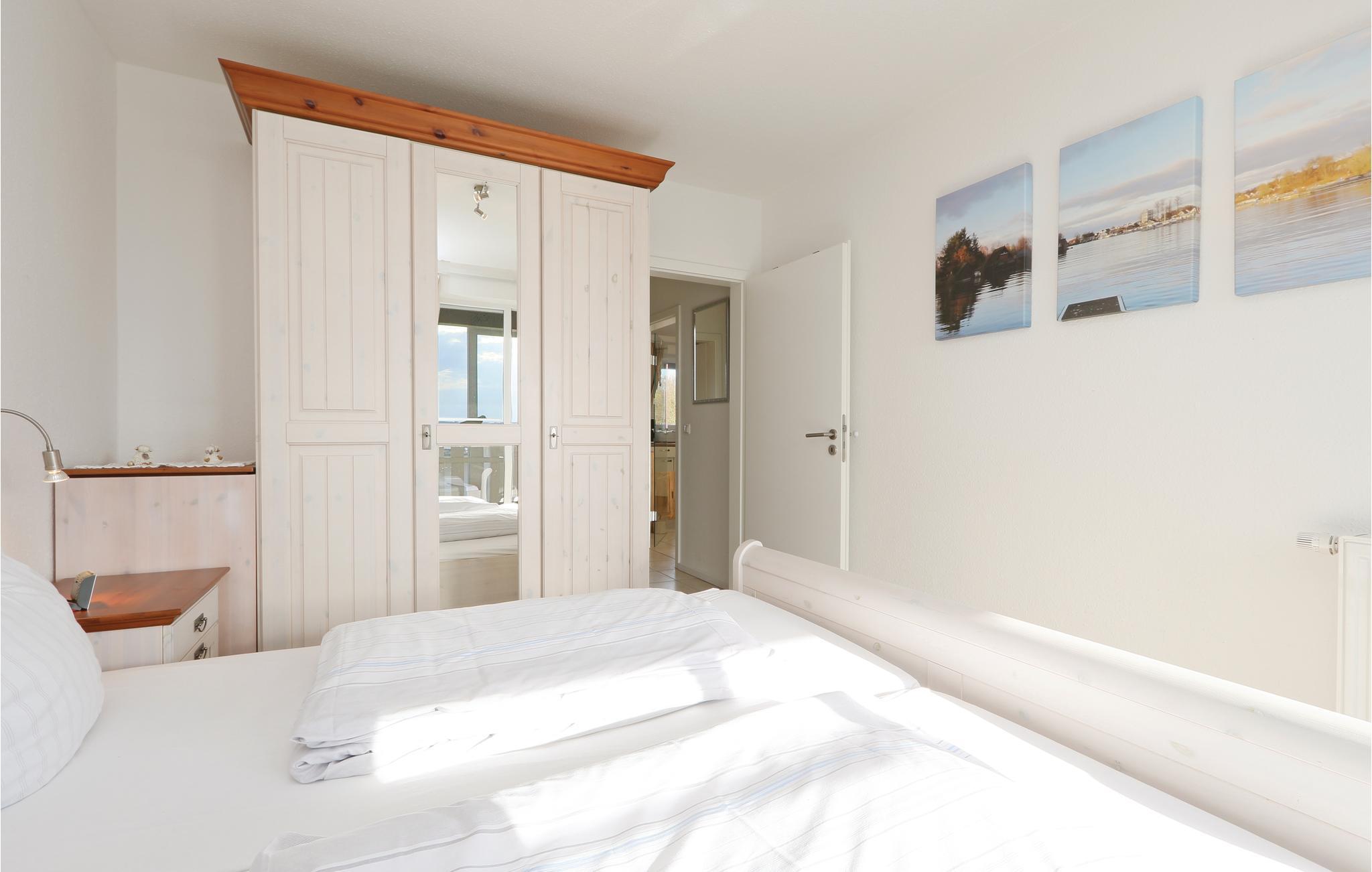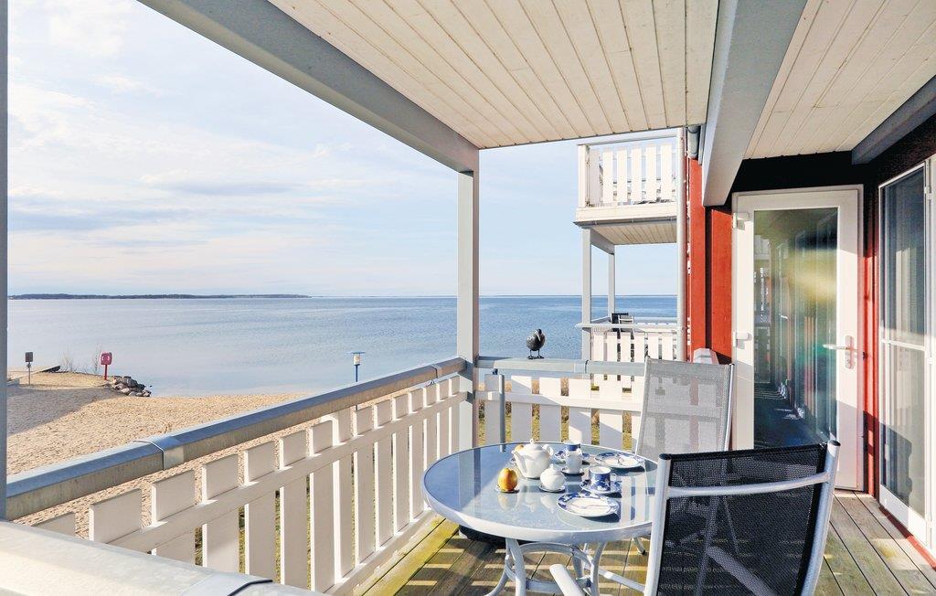 Soveværelset har dobbeltseng og lyse fyrremøbler. Herfra er der egen udgang til terrassen med udsigt over vandet. Der er yderligere en soveplads på sofaen i stuen, der kan trækkes ud og blive 140 cm bred. Der er føntørrer i badeværelset.