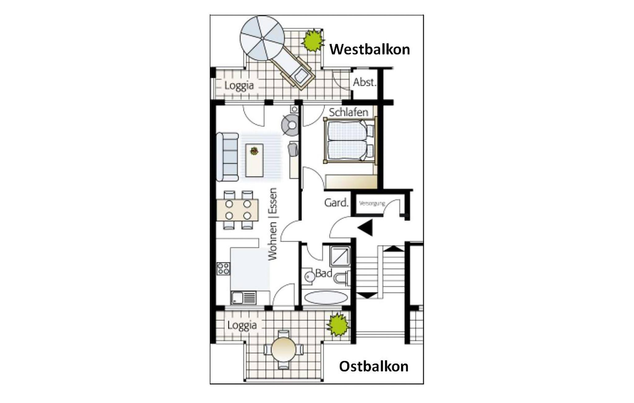 Ferielejligheden Mitteldeck ligger på første sal med skøn vid udsigt du over Müritz. Nyd udsigten over søen både fra soveværelserne og fra stuen. I kan også gøre jer det bekvemt på en af de to overdækkede terrasser: nyd den morgenmaden i den varme morgensol med udsigt over det naturbeskyttede naboområde. Fra midt på dagen vandre solen over på vestterrassen hvorfra der er udsigt over vandet.