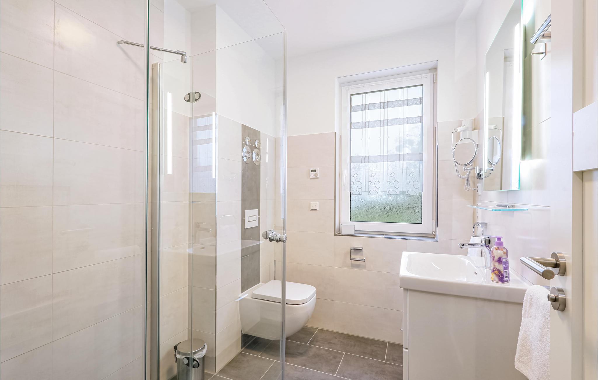 I badeværelset er der wc, håndvask og en stor brusekabine.