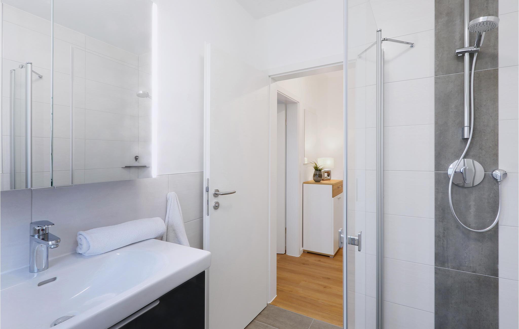 I badeværelset er der wc, håndvask og en stor brusekabine.