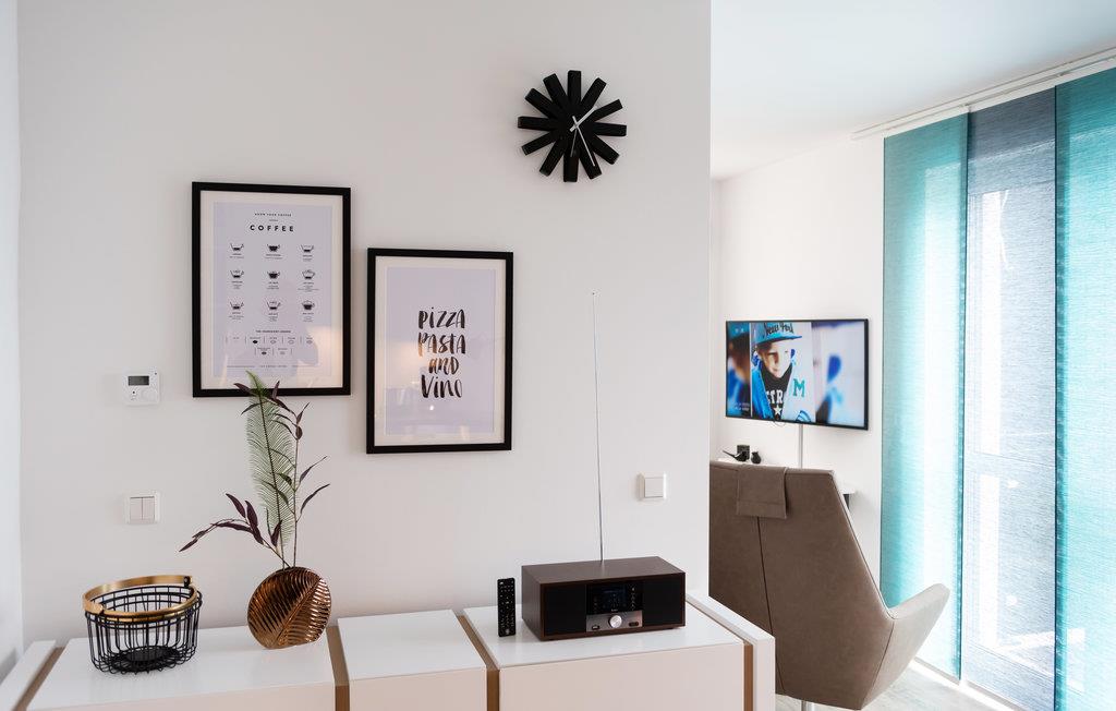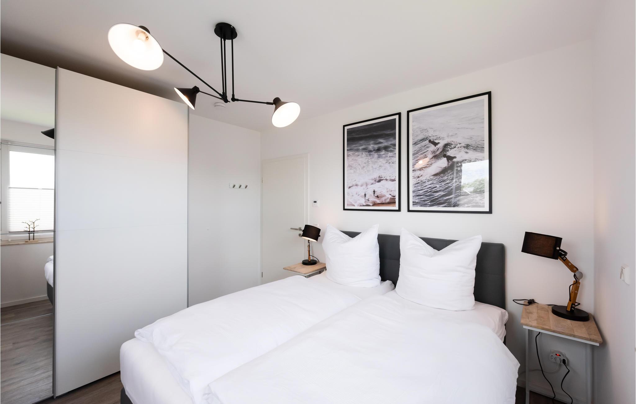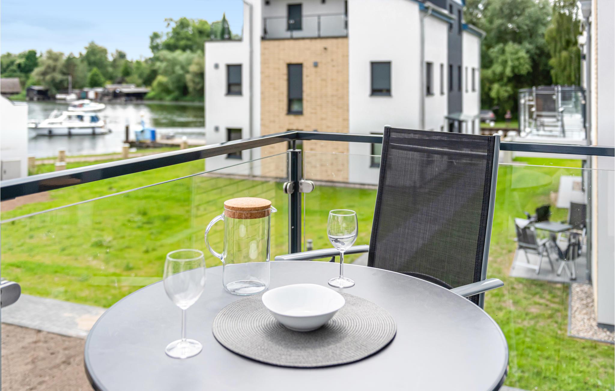 Lejligheden er moderne og komfortabelt indrettet og tilbyder direkte adgang fra stuen og det åbne køkken til den overdækkede terrasse med udsigt over marinaen og Müritz-kanalen. Her kan du starte dagen med en afslappet morgenmad eller afslutte den med et glas vin.