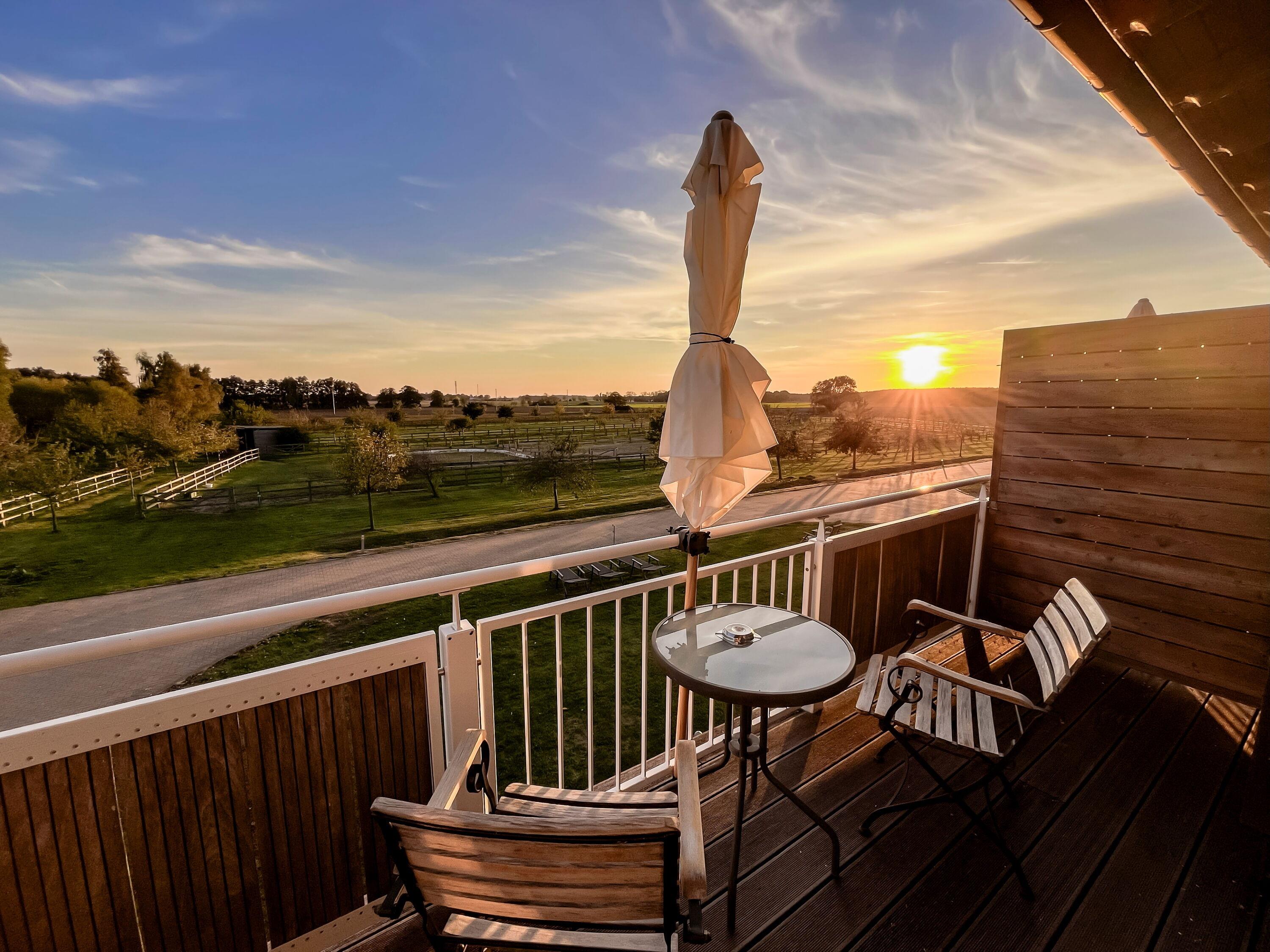 Balkon: Vom Wohnbereich aus gelangen Sie auf einen großzügigen Balkon mit Gartenmöbeln und Sonnenschirm, der einen weiten Blick über die Pferdekoppel, Wiesen und Felder bietet.