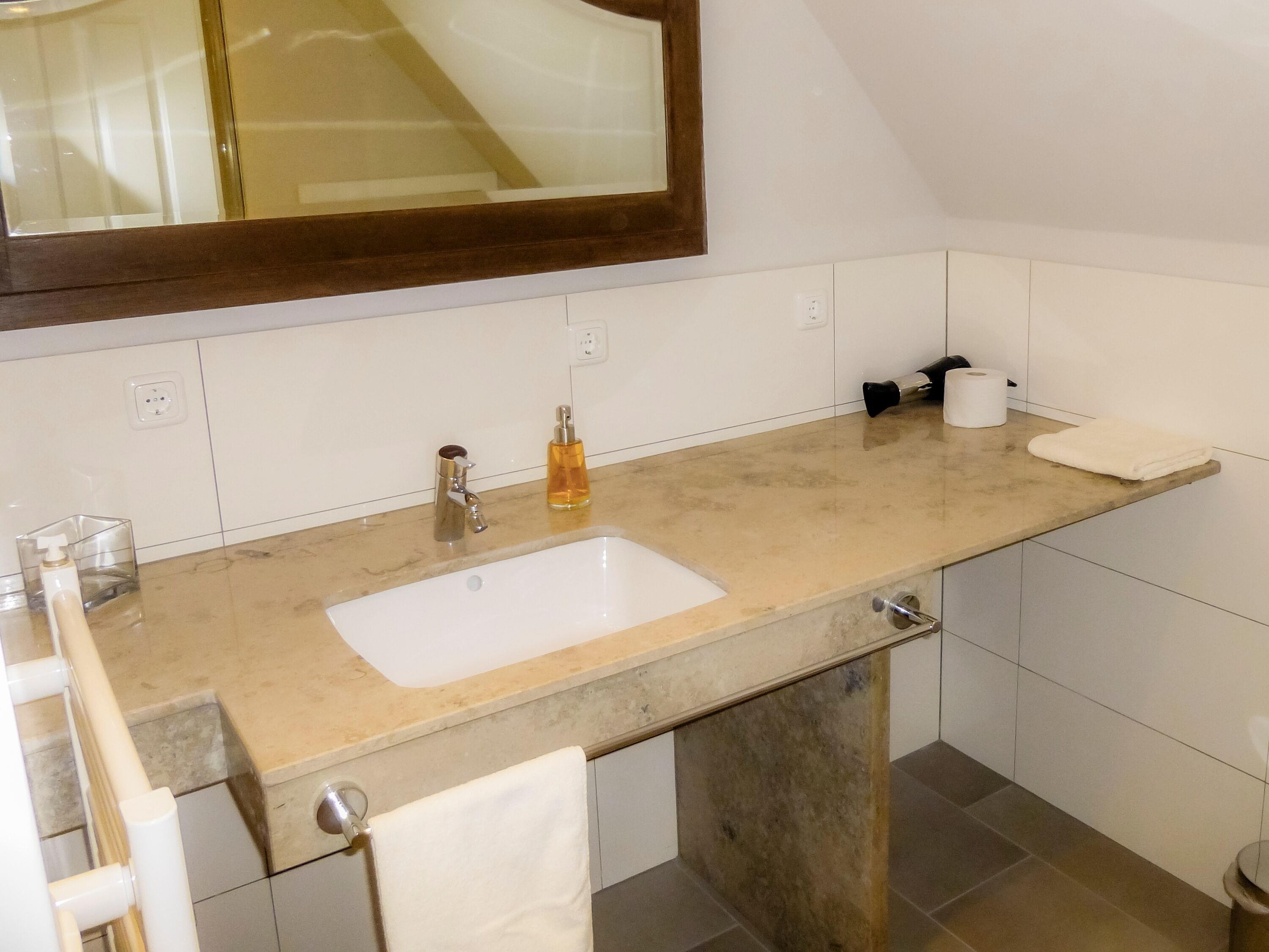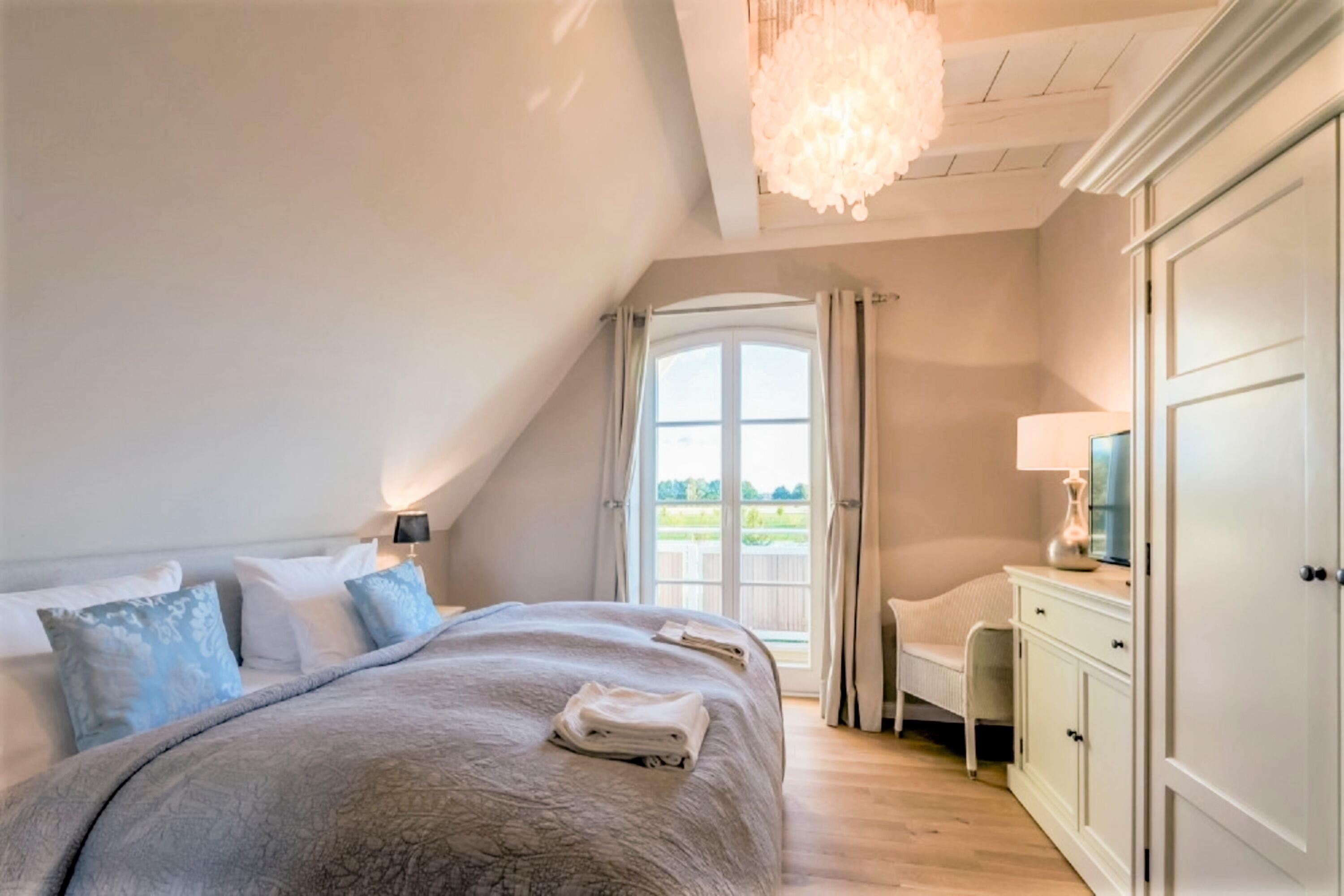Für noch mehr Platz und Komfort können Sie die Mastersuite im Dachgeschoss hinzubuchen. Diese bietet ein drittes Schlafzimmer mit Boxspringbett und ein weiteres hochwertiges Badezimmer mit Dusche und WC. Preis: 30 € pro Tag. Der Zugang erfolgt bequem über eine Treppe innerhalb der Wohnung.