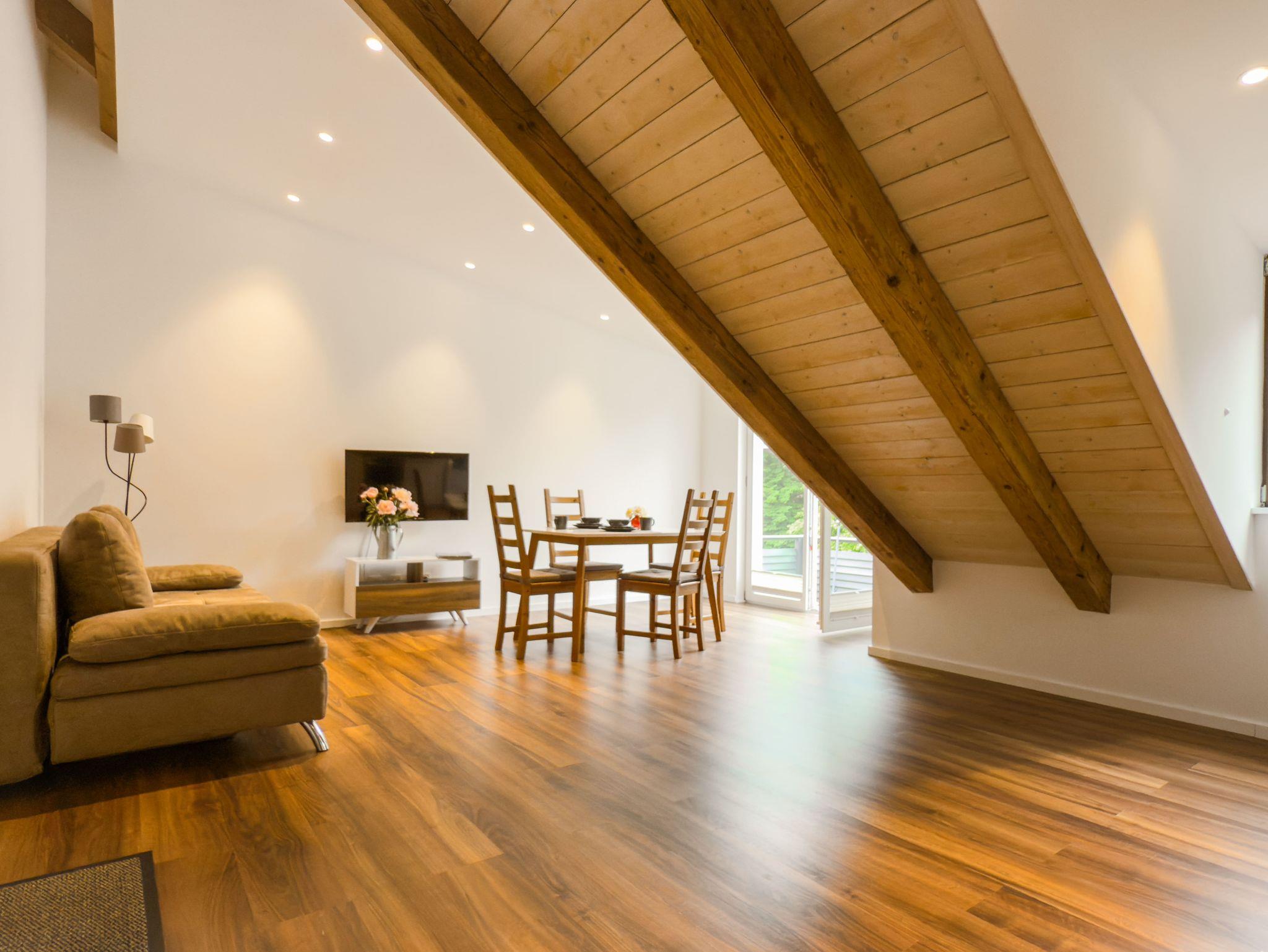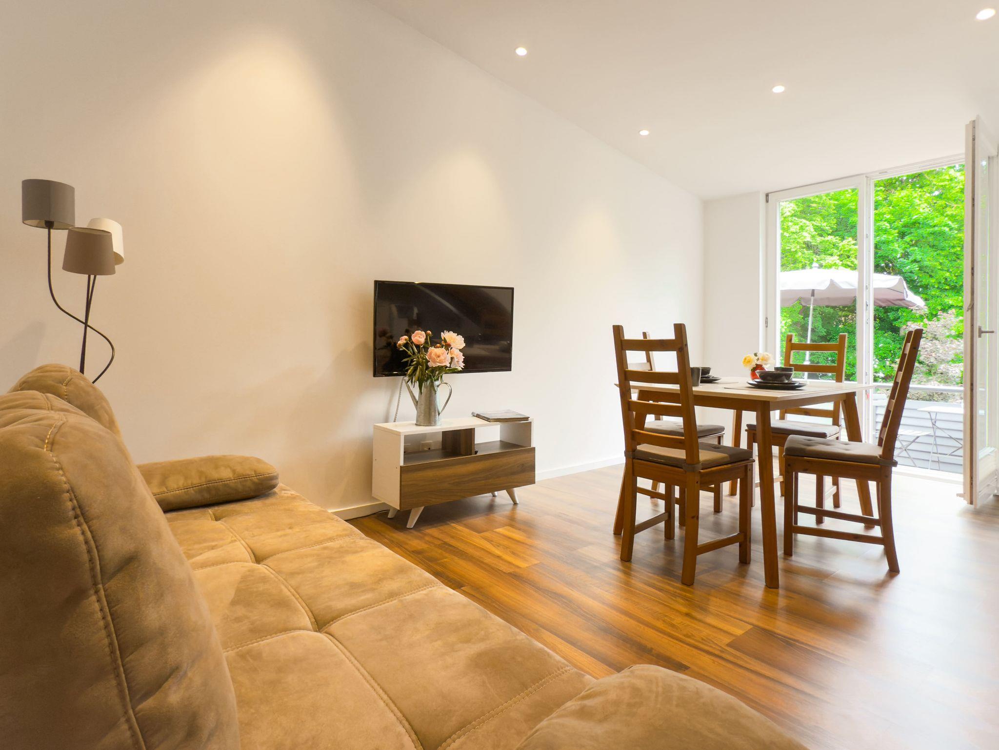 Im Wohnbereich befindet sich außerdem ein Esstisch mit 4 Stühlen, ein Flachbildfernseher mit Kabelanschluss und eine Schlafcouch, die nach Bedarf zu einem weiteren Bett mit 140 x 200 cm einfach umgebaut werden kann.