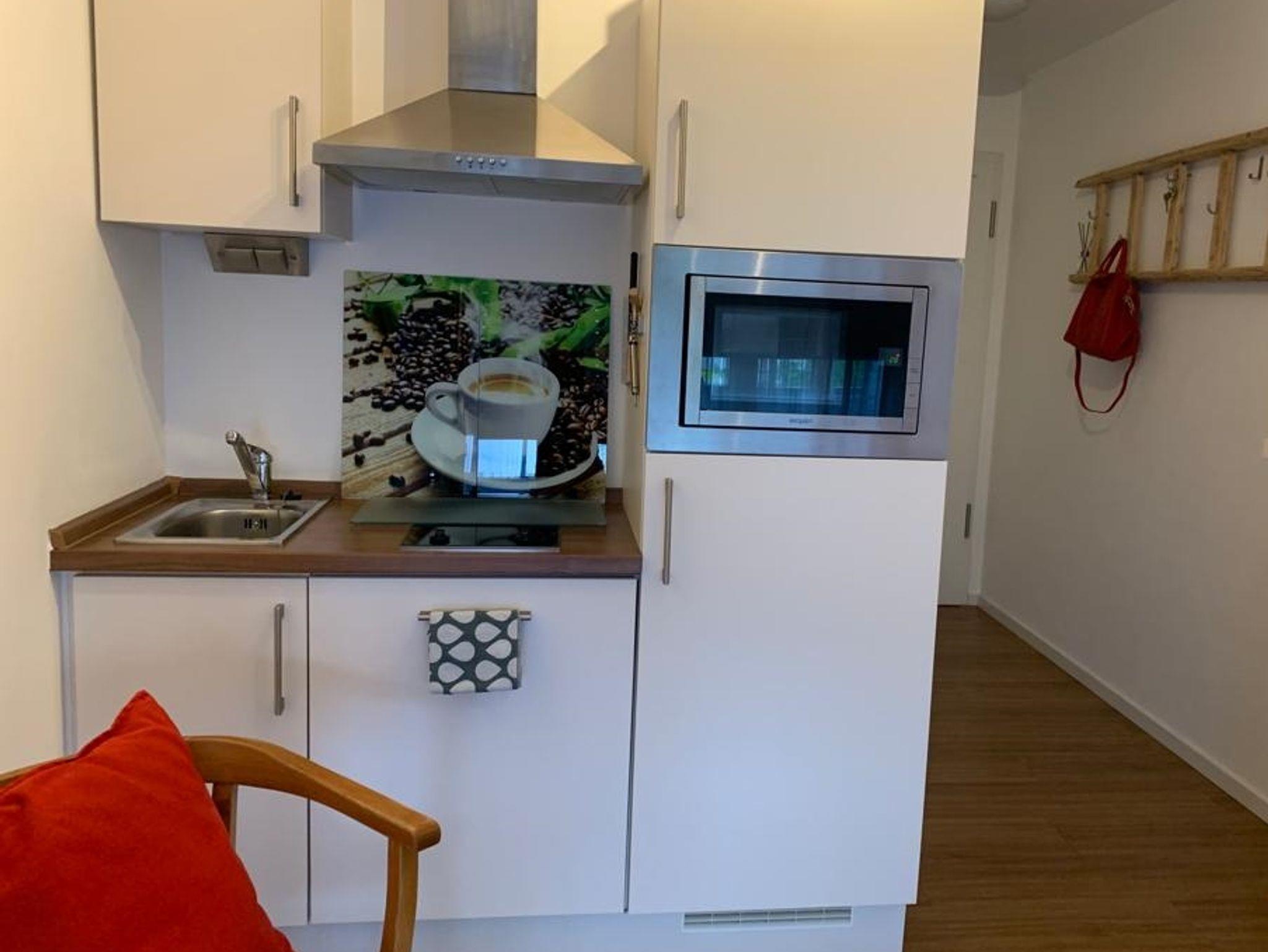 Schatzkästchen in Top Lage, alles da auf kleinstem Platz. Voll ausgestattetes Appartement (20 qm) mit Balkon zum ruhigen Innenhof. Das Appartement liegt im 3. Stock und ist bequem und barrierefrei über den Aufzug zu erreichen. Im kombiniertem Wohn- und Schlafbereich befinden sich Schlafmöbel, je nach Bedarf ein Einzelbett (90x200) mit Sitzgelegenheit Schrank und Garderobe. Die Mini-Wohnküche verfügt über ein 2-Platten Cerankochfeld mit Dunstabzugshaube, Spüle, Kühlschrank mit Gefrierfach, Geschirrspülmaschine, Mikrowelle mit Grillfunktion sowie eine Mokka-Kaffeemaschine. Ein Esstisch für 2 Personen steht ebenfalls zur Verfügung. Das Bad ist ausgestattet mit Dusche, WC und Waschbecken. Die gesamte Wohnung verfügt über eine Fußbodenheizung.