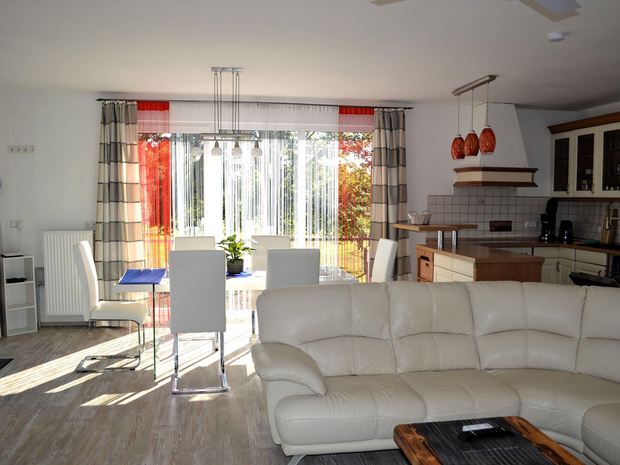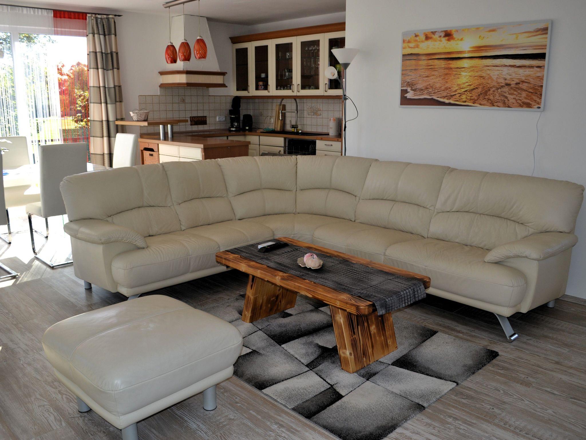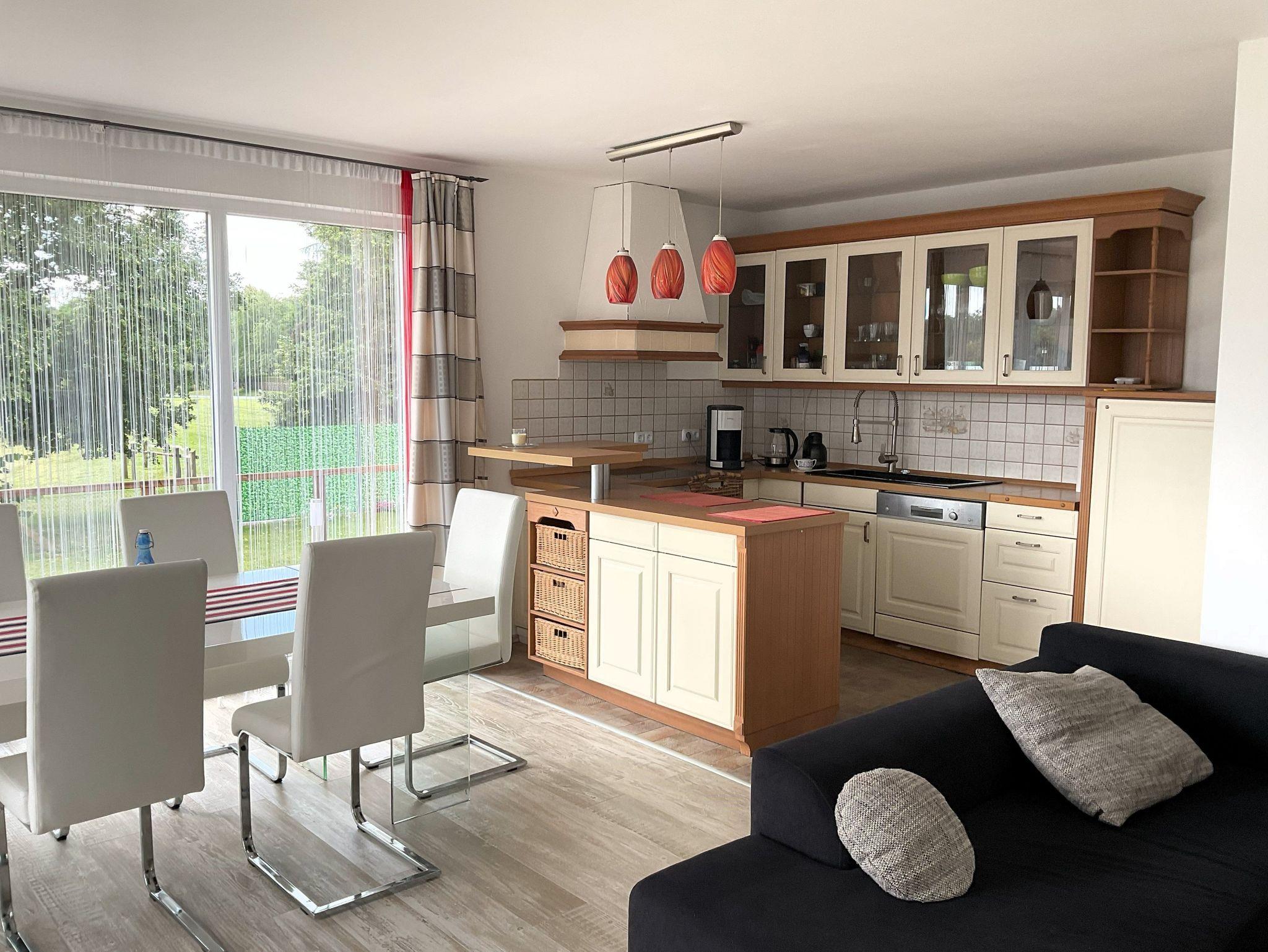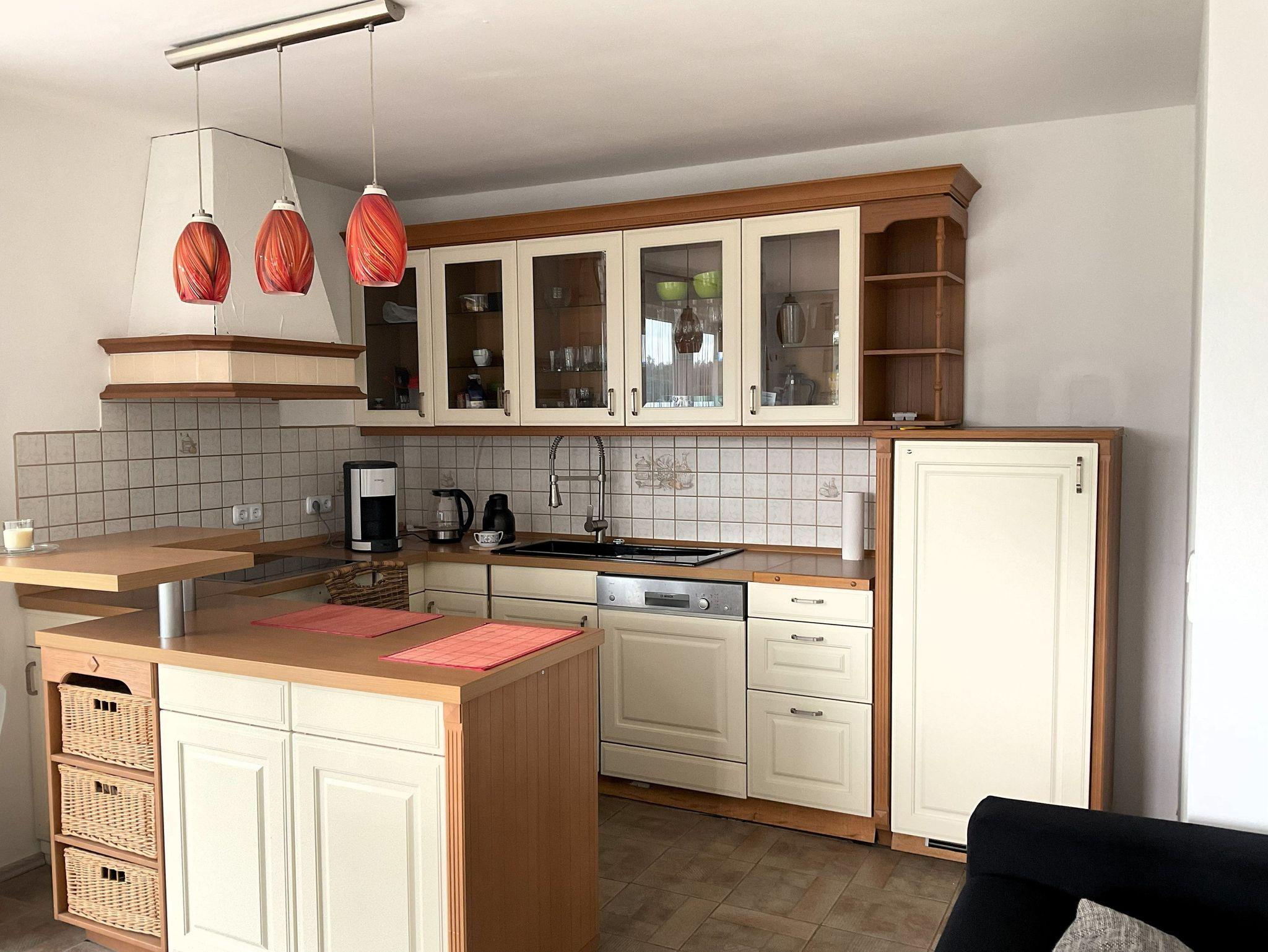 Die Wohnfläche beträgt ca. 80 m². Es steht Ihnen ein Wohnraum mit offener moderner, komplett eingerichteter Küche (E-Herd mit Backofen, Geschirrspüler, Toaster, Wasserkocher, Kaffeemaschine), ein Schlafzimmer mit einem Doppelbett, Flur sowie Bad mit Badewanne und Dusche zur Verfügung. Im Wohnraum gibt es eine gemütliche Sitzgarnitur, einen Esstisch mit 4 Stühlen sowie einen Fernseher. Eine Waschmaschine kann genutzt werden.
