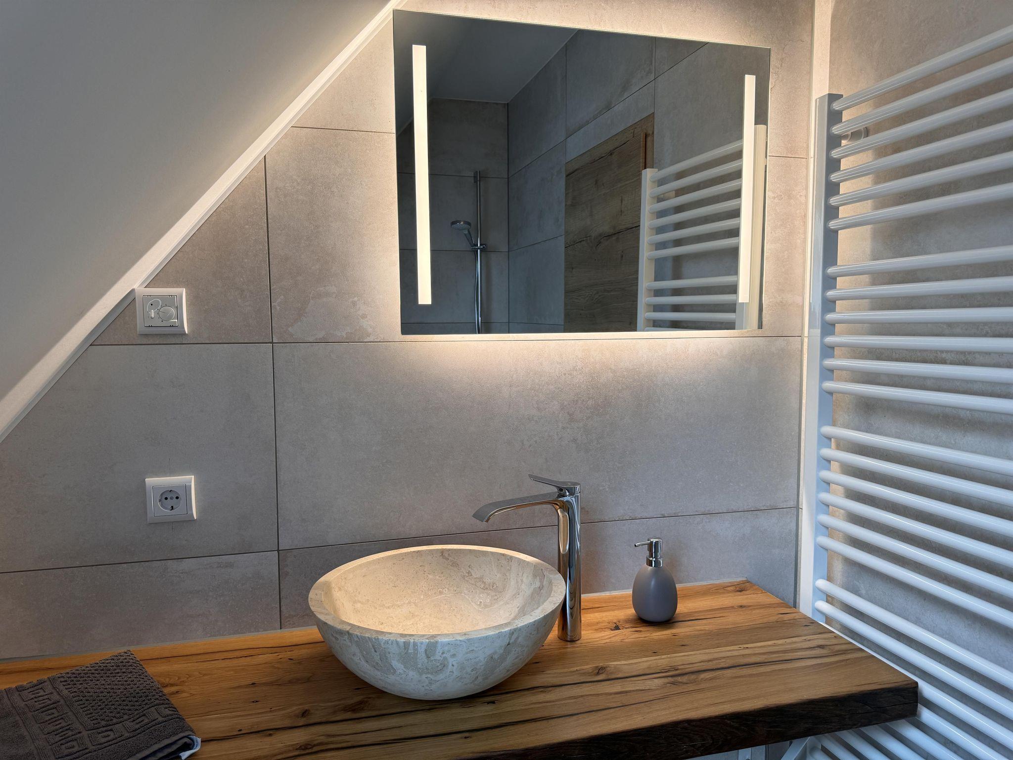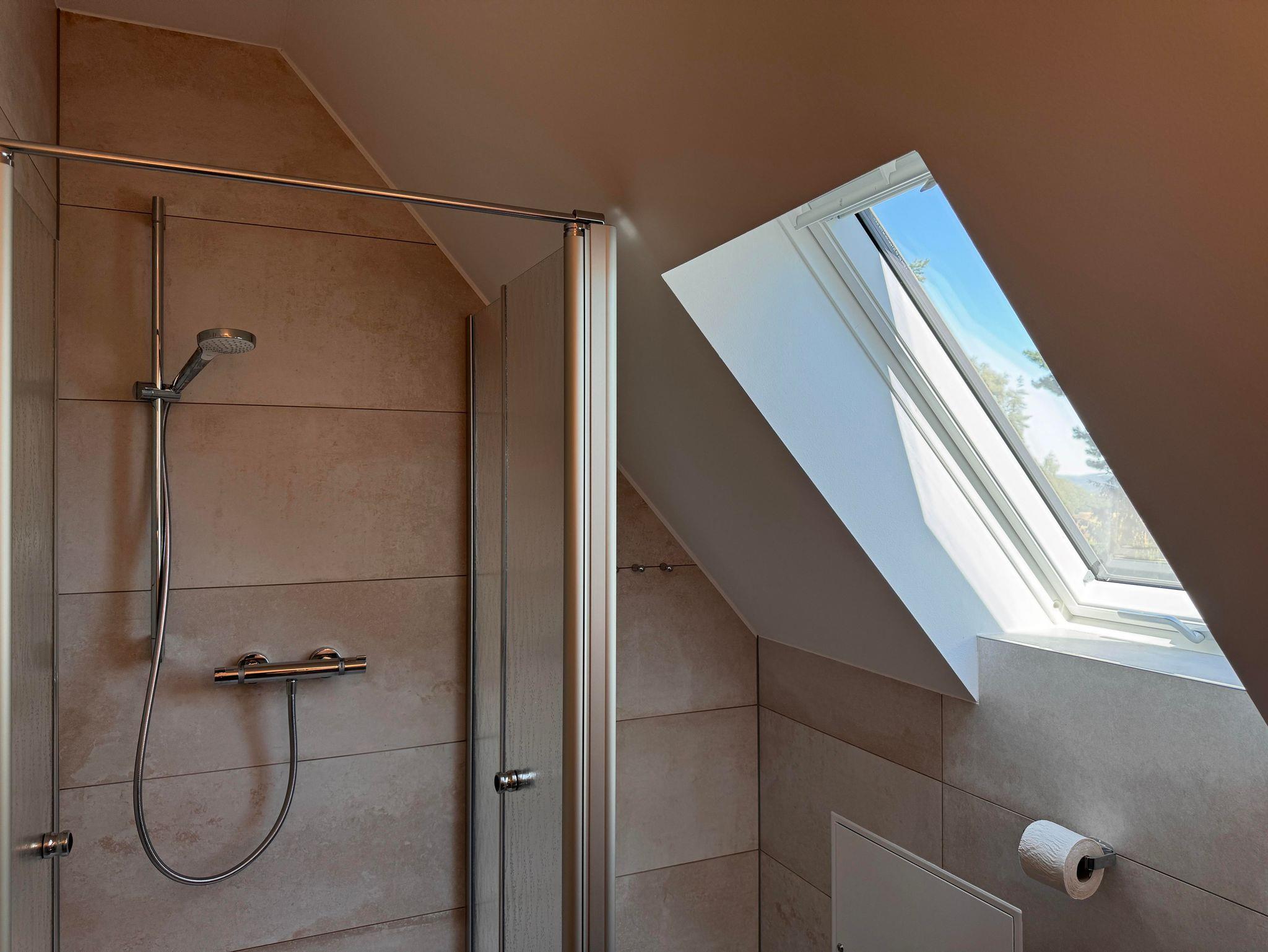 Das moderne Badezimmer sorgt für zusätzlichen Komfort während Ihres Aufenthalts. Bei Bedarf verwandelt sich die bequeme Couch im Wohnbereich in eine Schlafcouch, sodass auch zusätzliche Gäste bequem untergebracht werden können.