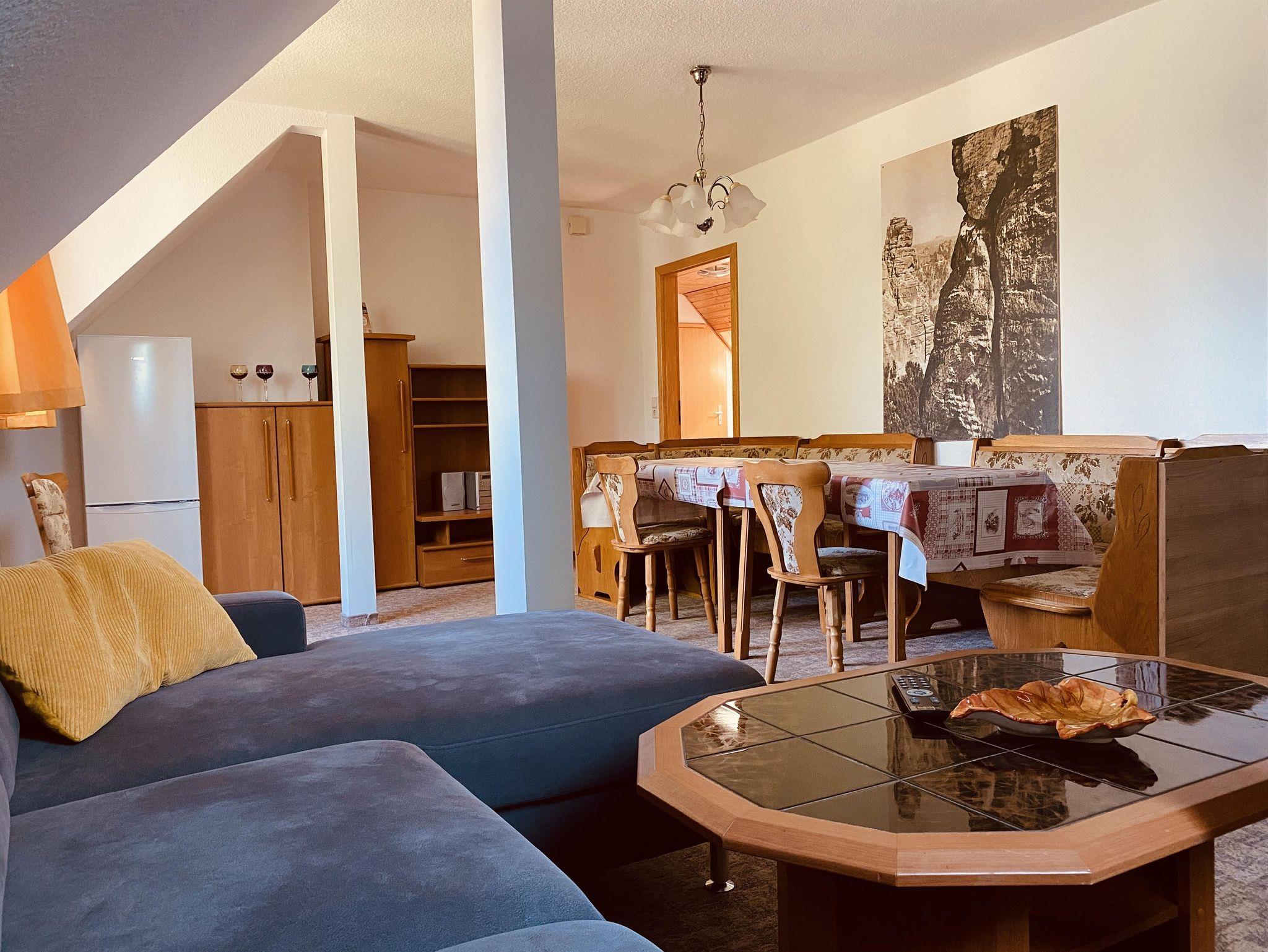 Die wunderschöne und geräumige Dachwohnung Lehnsteig bietet mit einer Wohnfläche von 91 m² bis zu 6 Personen ausreichend Platz. Die Dachschrägen sorgen für eine einzigartige Wohlfühlatmosphäre. Weiterhin können Sie durch die großzügigen Fensterfronten den Blick auf die Schrammsteine genießen. Die Wohnung verfügt über zwei getrennte Schlafzimmer und eine moderne Küche. Diese ist mit einem Backofen inkl. Ceranfeld, Kühlschrank, Kaffeemaschine, Wasserkocher und Toaster ausgestattet. Das Badezimmer hat eine Dusche sowie ein separates WC.