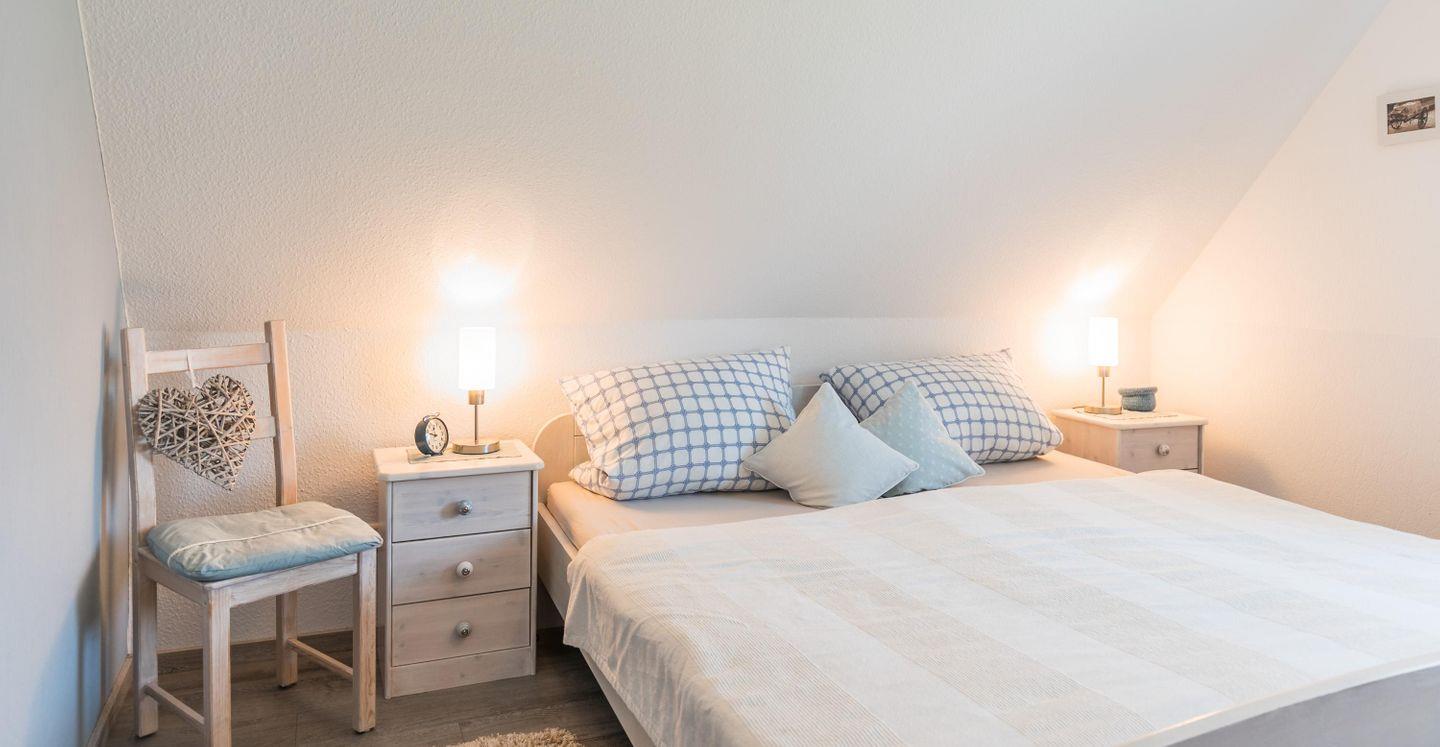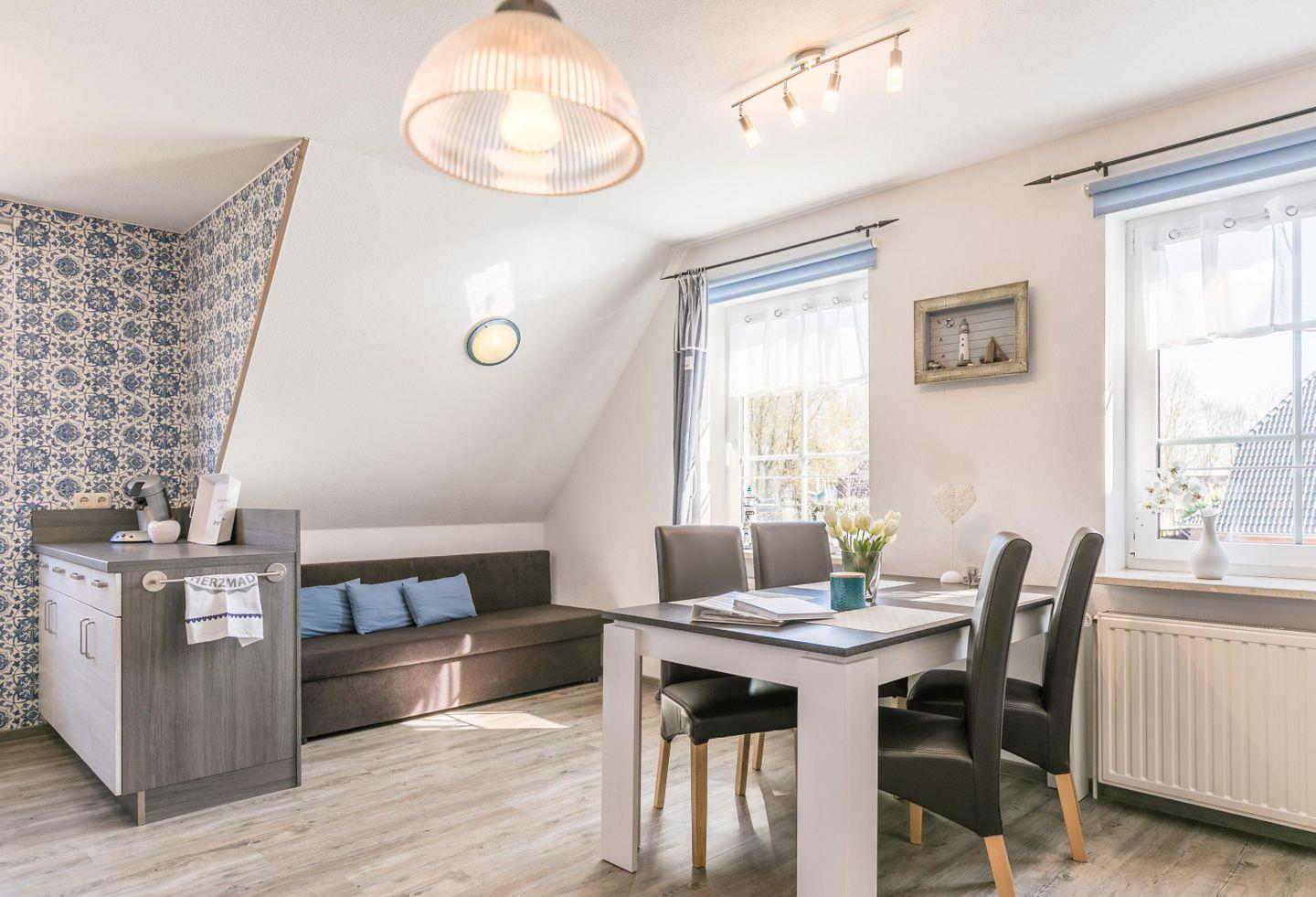 Die Wohnung liegt im 1. Obergeschoss, hat ein modernisiertes Schlafzimmer mit Doppelbett und zwei Schlafsofas im Wohnbereich. Eine maximale Belegung von 2 erwachsenen Personen und einem Kind ist daher möglich! Die Mitnahme eines weiteren Kindes auf Anfrage und gegen Aufpreis möglich.