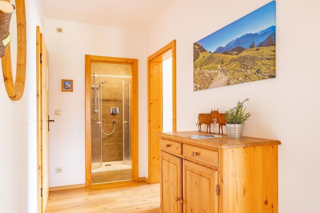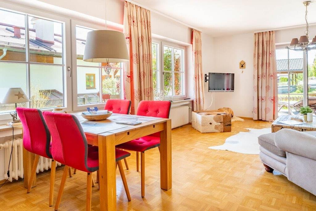The ground-floor apartment in Landhaus St. Markus is 50 square meters and can accommodate up to four people plus one infant. The apartment features a large living room with a sofa bed and an open-plan kitchen with a dining area. The bedroom with a double bed (180 x 200 cm) has a large wardrobe and a second flat-screen TV. The bathroom with shower was newly renovated in 2021. The apartment is very bright, as all rooms have windows. The large, sunny terrace is in a quiet location overlooking the garden and features new garden furniture (2021). The apartment is furnished with new garden furniture. Note: We also rent out 3 other apartments at Landhaus St. Markus: Apartment No. 1, Kaiserblick: ? Living space approx. 60 m² on the 2nd floor with a large terrace on the 1st floor ? Max. 4 guests + 1 infant Apartment No. 3, Jägerglück: ? Living space approx. 35 m² on the ground floor with a large terrace and garden ? Max. 2 guests Apartment No. 4, Chalet Alpin: ? Living space approx. 85 m² on the 1st floor with a large balcony ? Max. 5 guests and one infant Please scroll to the bottom for the links.
