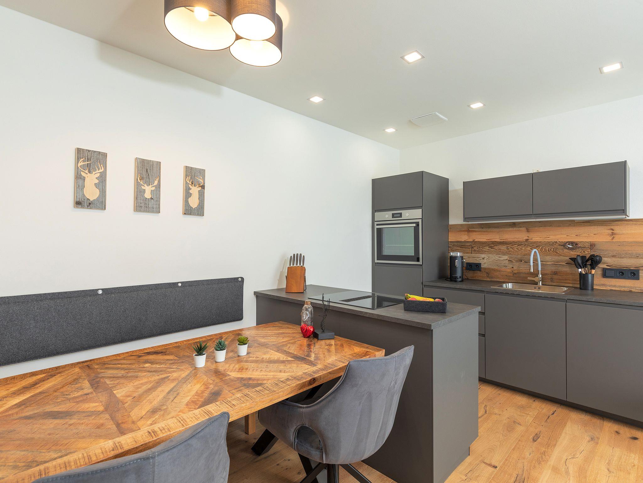 • Designküche mit Induktionskochfeld, separatem Backofen, Geschirrspüler, Mikrowelle, Kühlschrank mit Gefrierfach, Nespressomaschine, Toaster, Wasserkocher und vielem mehr
