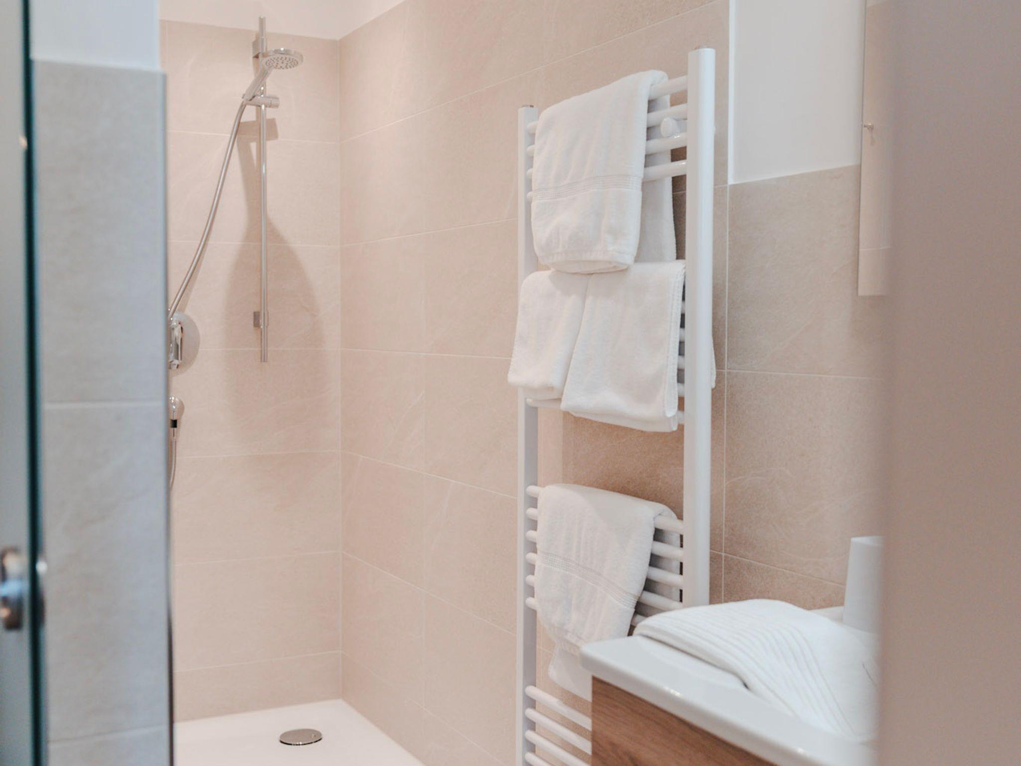 (Dusche, Waschbecken und WC), getrennt durch eine Glasschiebetür mit Sichtschutz.