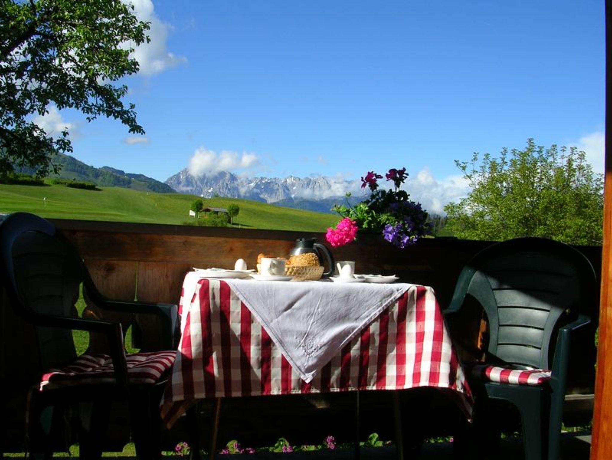 2-Zimmer-Wohnung mit großem Südbalkon und herrlichem Bergblick auf das Kaisergebirge. Komplette Ausstattung der Küche (Mikro), Kabel-TV und Radiowecker. Sehr ruhig. Auf Wunsch Brötchenservice oder mit Frühstück.