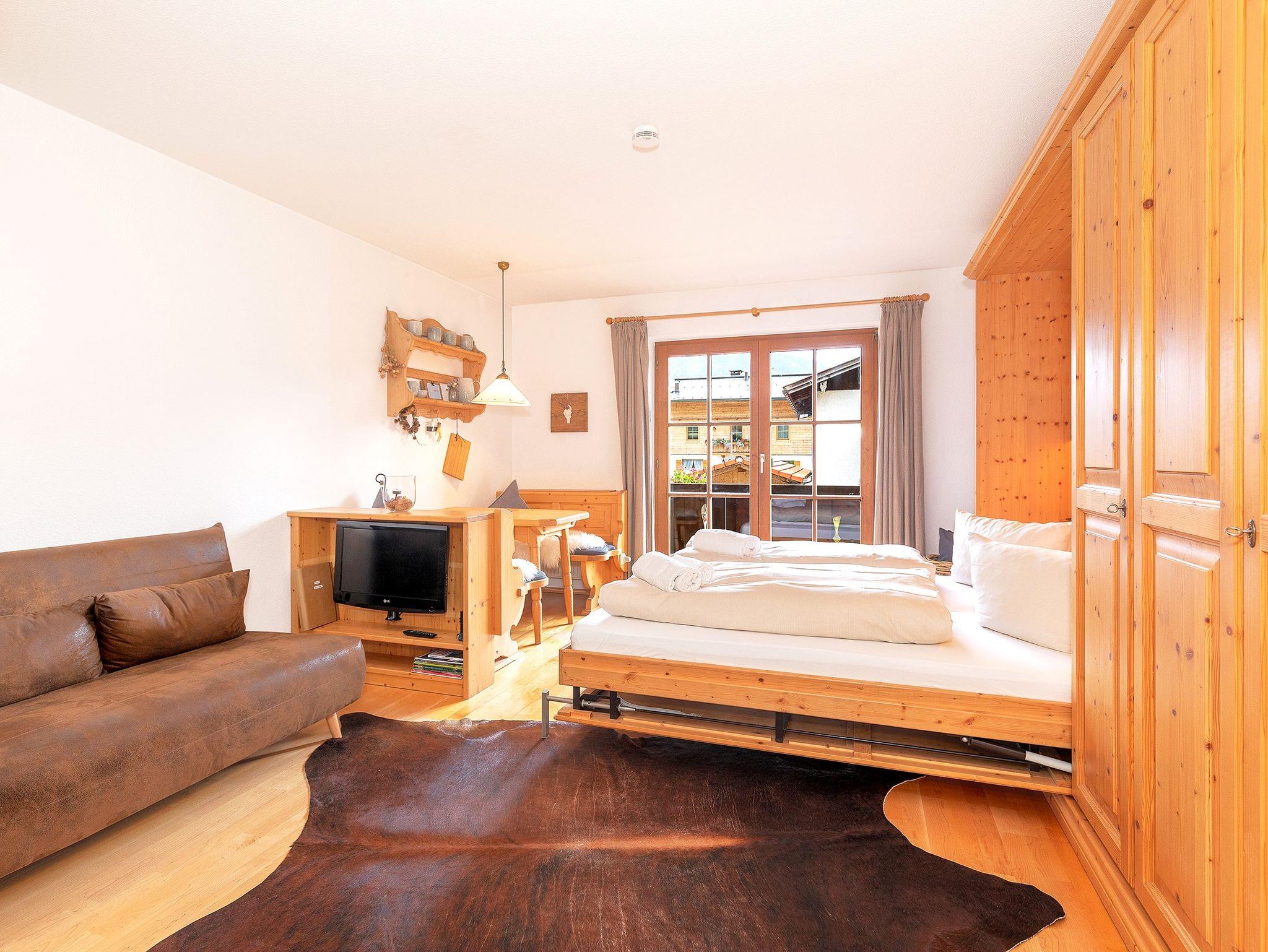 Die Wohnung selbst bietet Ihnen einen großzügigen Wohn- und Essbereich, der mit einem klappbaren Schrankbett, einer neuen Couch (2025) und einem Esstisch ausgestattet ist. Die Küchenzeile verfügt über einen Kühlschrank, zwei Herdplatten, Toaster, Kaffeemaschine und Wasserkocher – alles, was Sie für einen entspannten Aufenthalt benötigen. Genießen Sie die frische Bergluft auf dem möblierten Südbalkon mit herrlichem Blick auf die umliegenden Berge.