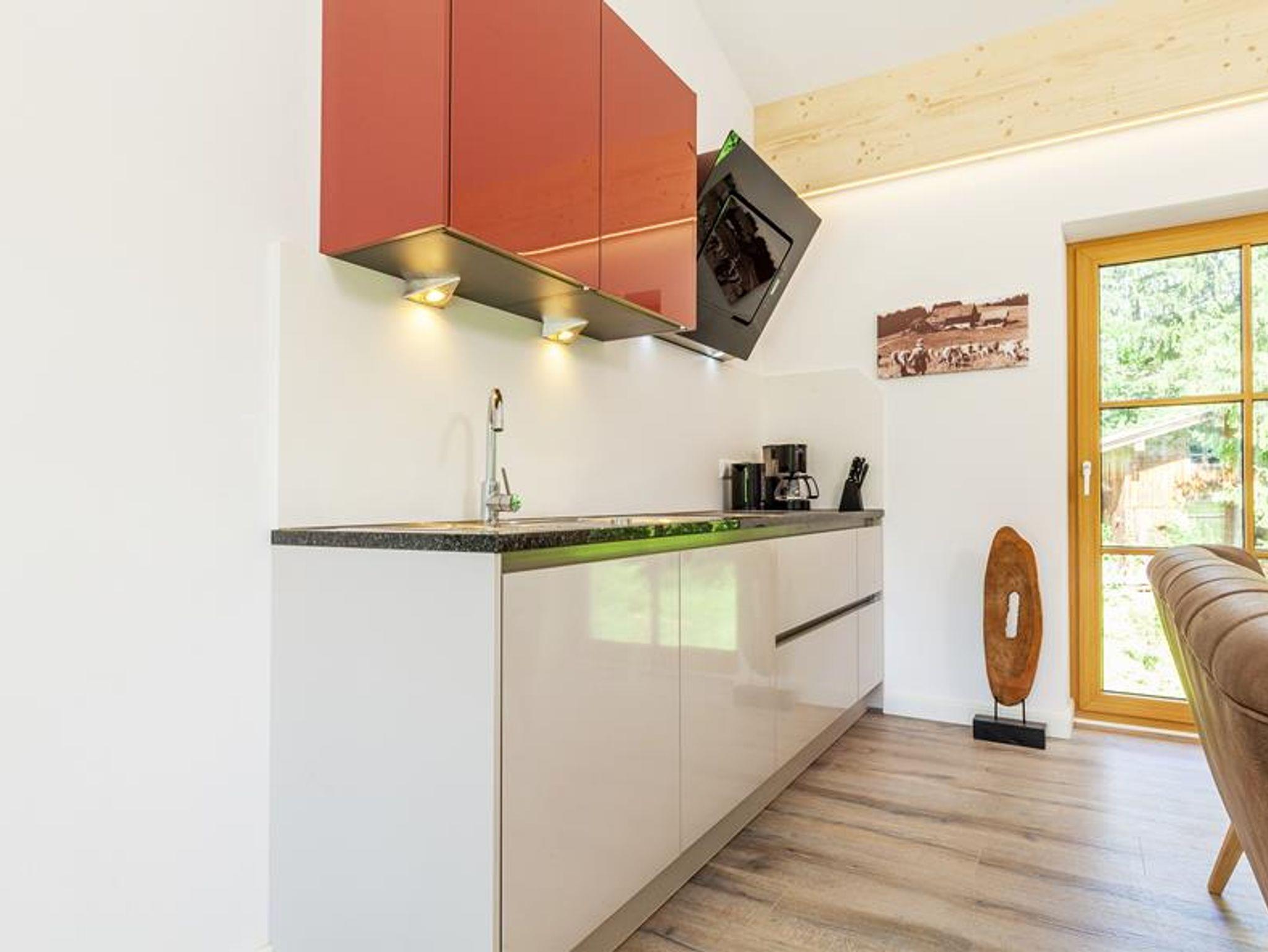 Die Küchenzeile im Wohn-Esszimmer verfügt über einen 4-Platten-Elektroherd mit Backofen, Kühlschrank und Gefrierfach. Ebenfalls stehen Ihnen eine Kaffeemaschine, Wasserkocher und ein Toaster zur Verfügung.