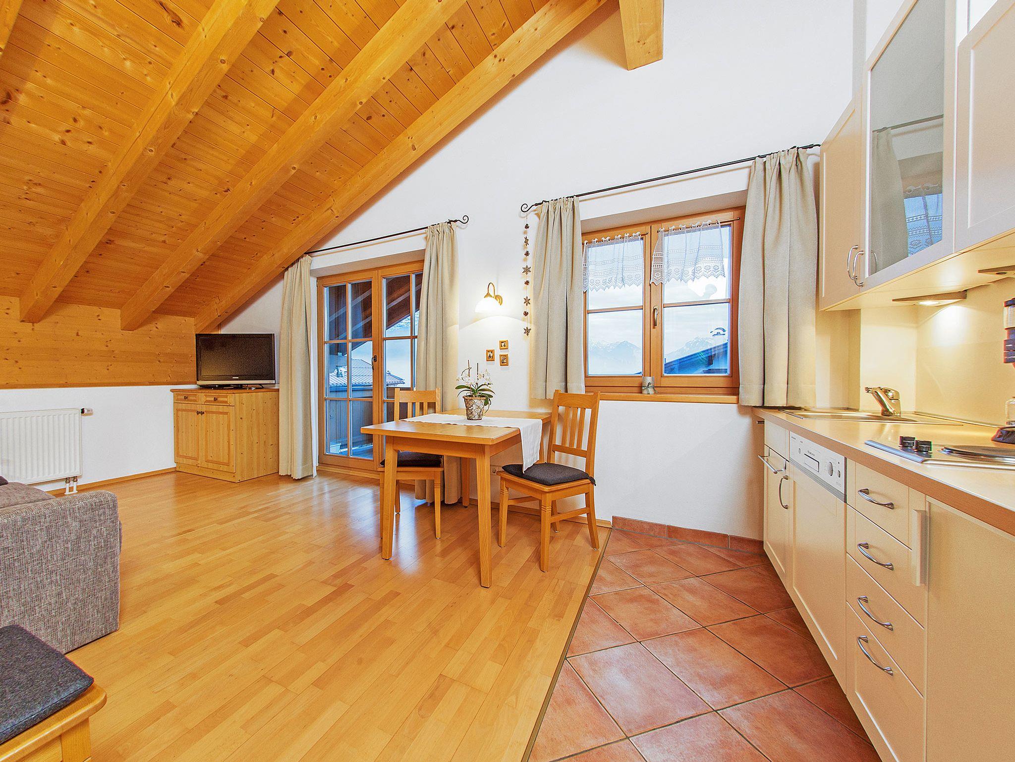 Sonnige 2-Zimmer-Ferienwohnung im 1.OG, Größe ca. 33 m². Der große Süd-Balkon bietet freien Blick ins Kaisergebirge und den Unterberg. An der kleinen Essecke im Wohnraum können Sie die selbst zubereiteten Mahlzeiten genießen. Die Küchenzeile ist mit einem Geschirrspüler ausgestattet. Allergikergerecht wurde in der gesamten Wohnung hochwertiges Echtholz-Parkett verlegt. Bettwäsche und Handtücher sind ausreichend vorhanden und werden nach Ihren Wünschen gewechselt. Für den Fernsehabend steht Ihnen ein DVD-Player sowie je ein Fernsehgerät in Wohn- und Schlafzimmer zur Verfügung. Die CD-Radio-Anlage komplettiert die Ausstattung. Das Duschbad im App. Walmberg wurde komplett renoviert. In unseren Badezimmern bekommen Sie keine kalten Füße! Dafür sorgt die ganzjährig beheizte Fußbodenheizung.