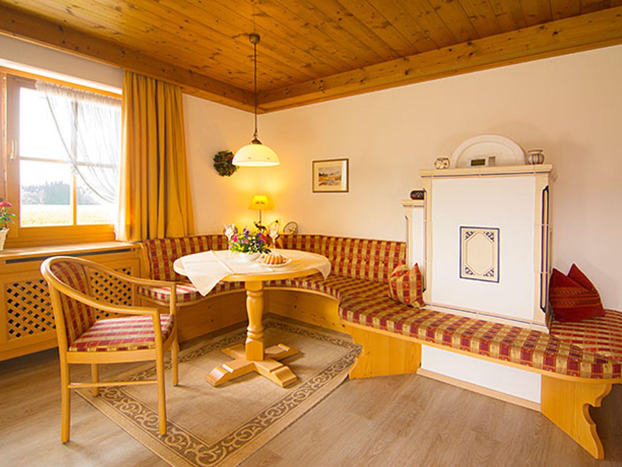 Die Wohnung ist mit hochwertigen Möbeln von unserem Dorfschreiner mit viel Liebe zum Detail im heimischen Stil gefertigt. Zudem ist die Wohnung mit einer separaten Küche mit 2 Ceran-Kochfeldern, Spülmaschine, Mikrowelle, Wasser- und Eierkocher, Toaster, Tassimo-Kapsel-Kaffeemaschine und weiteren komfortablen Extras ausgestattet. Der Wohnraum mit einem großzügigen Essbereich und einem heimeligen, elektrisch beheizbaren Kachelofen lässt keine Wünsche offen.