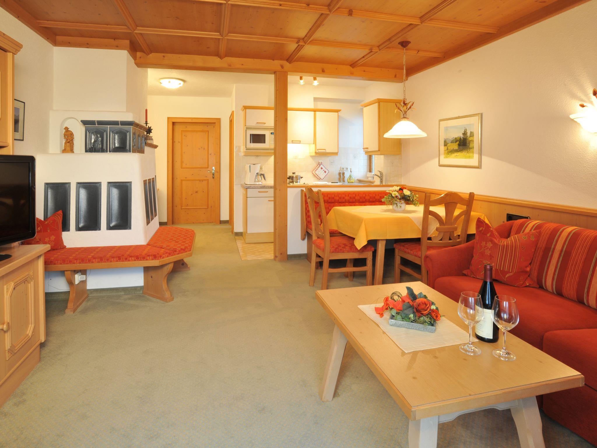 Bei der Einrichtung dieses Komfortappartements haben wir uns große Mühe gegeben, um Ihnen den Aufenthalt so angenehm wie möglich zu machen. Die Nichtraucherwohnung für 2- 4 Personen ist geschmackvoll mit hellen hochwertigen Einbaumöbeln im ländlichen Stil ausgestattet und beinhaltet Selbstwähltelefon, Kabel-TV, Mini-HIFI-Anlage, WLAN-Anschluss sowie eine komplett eingerichtete Küche mit Mikrowellenherd und Backofen. Das Bad verfügt über eine Dusche und WC. Im Wohnraum mit Südbalkon und Gebirgsblick befindet sich neben Essecke und Doppelausziehcouch auch ein Kachelofen mit gemütlicher Ofenbank. Der separate Schlafraum hat ebenfalls einen eigenen Balkon.