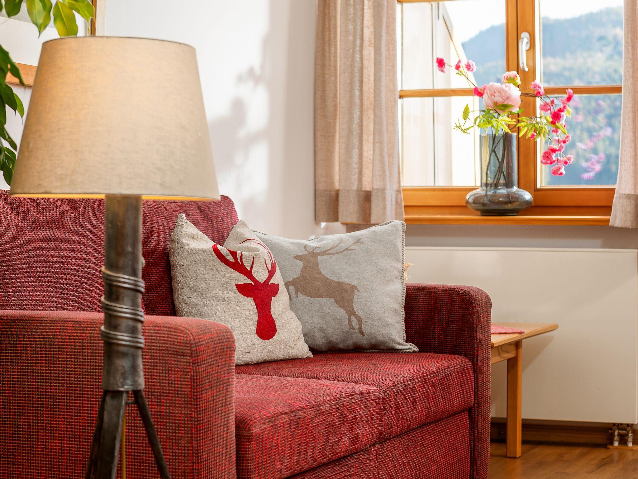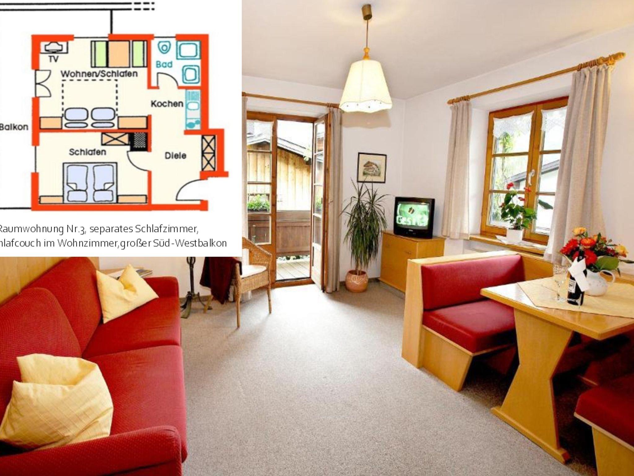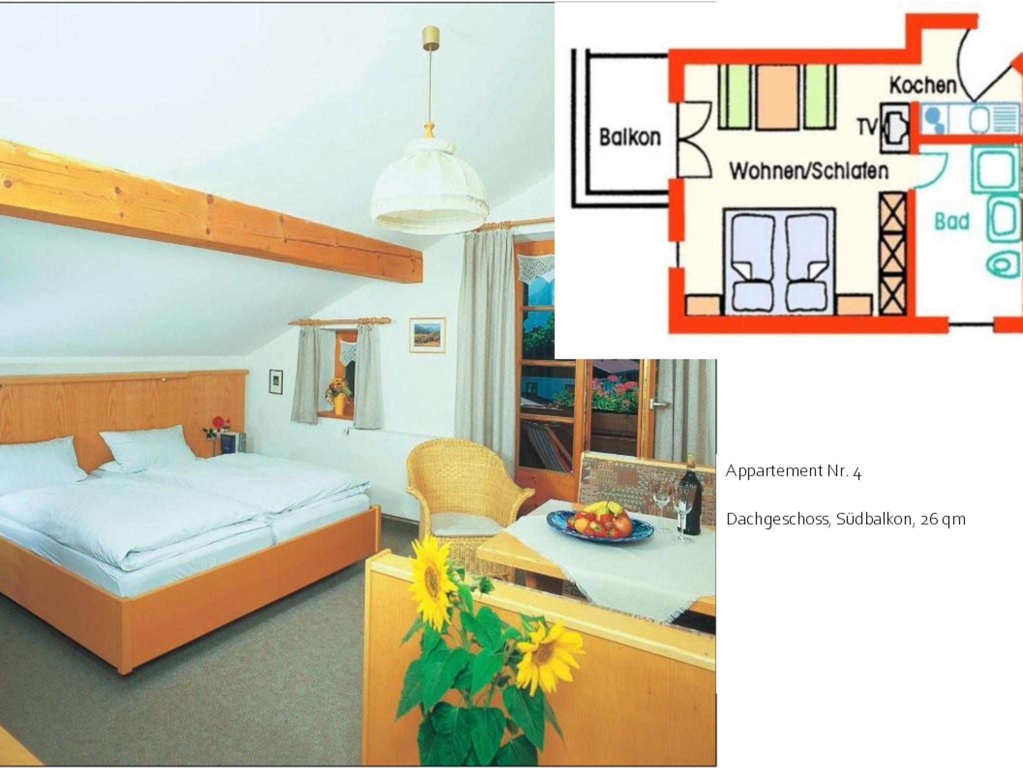 Die Zweizimmer-Ferienwohnung mit Wohn- und separatem Schlafraum ist ausgestattet mit einem Doppelbett, einer Sitzecke, Südbalkon, Kabel-TV sowie Telefon. Die Eckbank der Essgruppe im Wohnraum lässt sich in ein weiteres Bett verwandeln. Das Bad verfügt über Dusche/WC und Fön. Im Vorraum mit Garderobe befindet sich eine Küchenzeile. Vom Südbalkon aus haben Sie einen herrlichen Bergblick.