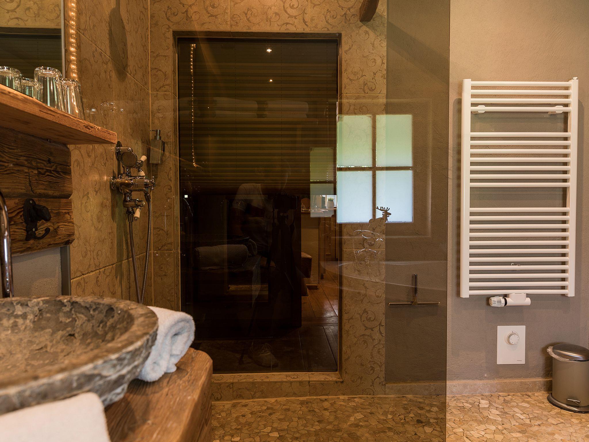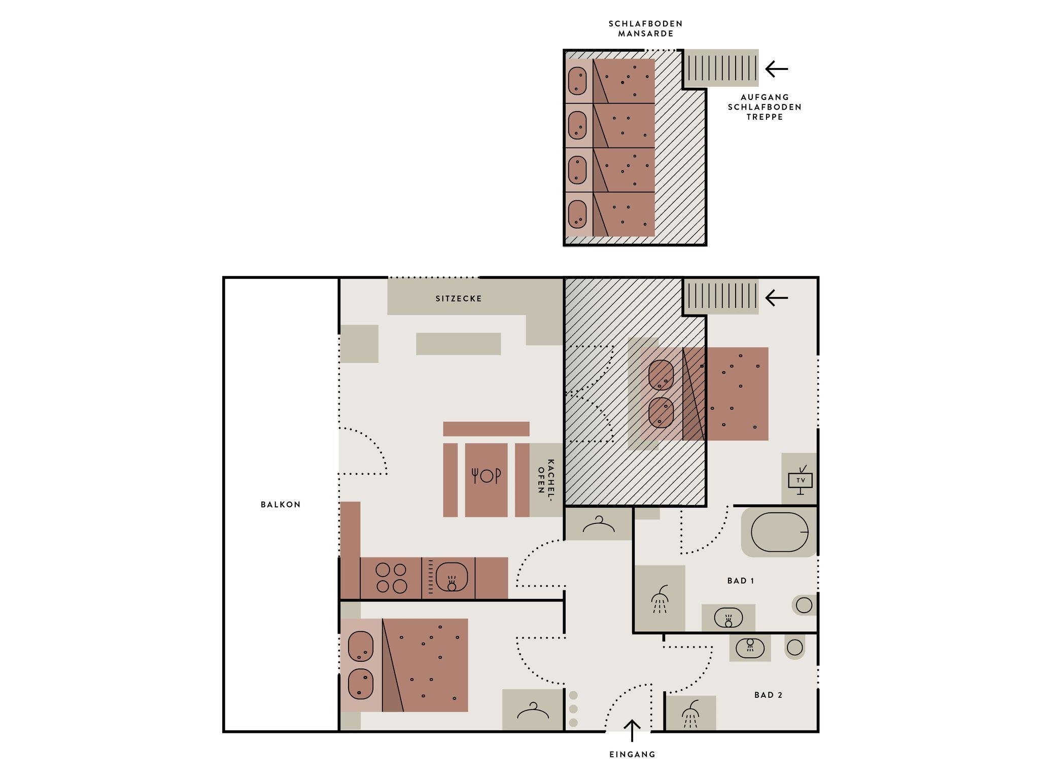Das großzügige, stilvolle Apartment im modernen Landhausstil besteht aus einer einladenden Diele, einem großen Wohn-Essraum mit voll ausgestatteter Küche, Kachelofen, zwei Flat-Screen-TVs und großer Sitzecke, zwei separaten Schlafzimmern mit Doppelbetten (180x200/160x200), einem urigen, über eine Holztreppe zu erreichenden Schlafboden (Dachschräge) mit vier nebeneinander liegenden Einzel-Betten (4x90x200) sowie zwei modernen Bädern mit großen Spiegeln, Steinwaschbecken, bodenebenen Duschen, Eckbadewanne, Handtuch-Heizkörpern und Fußbodenheizung.