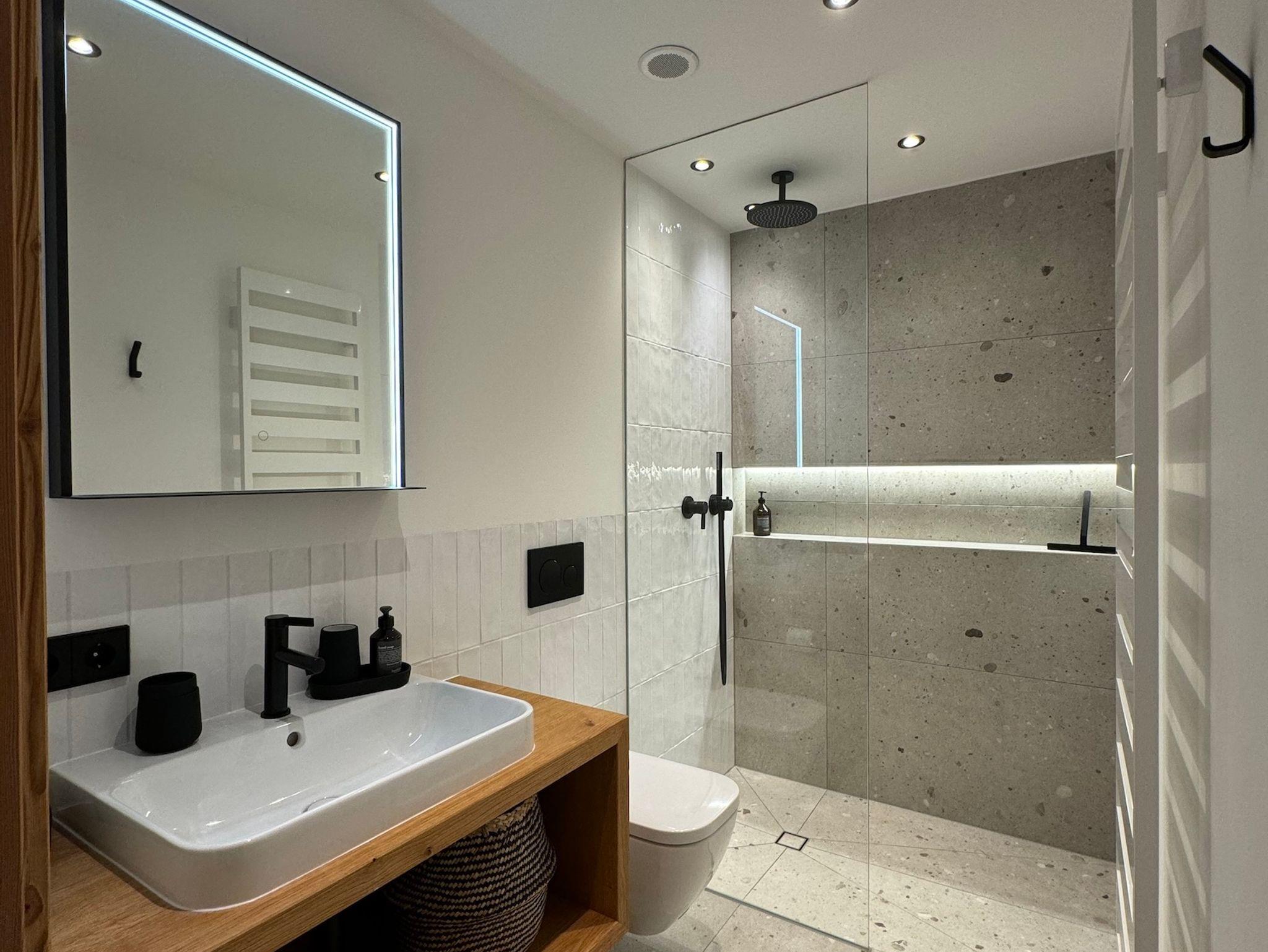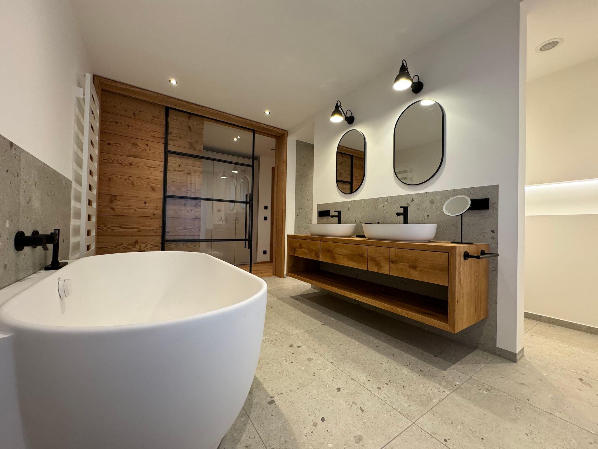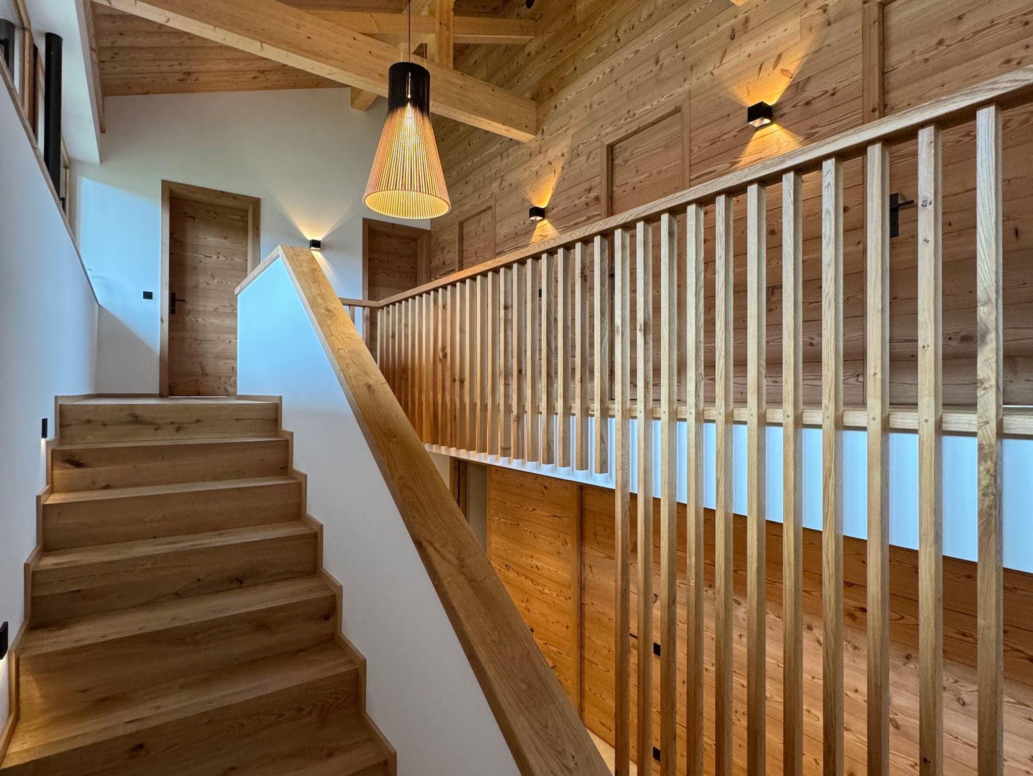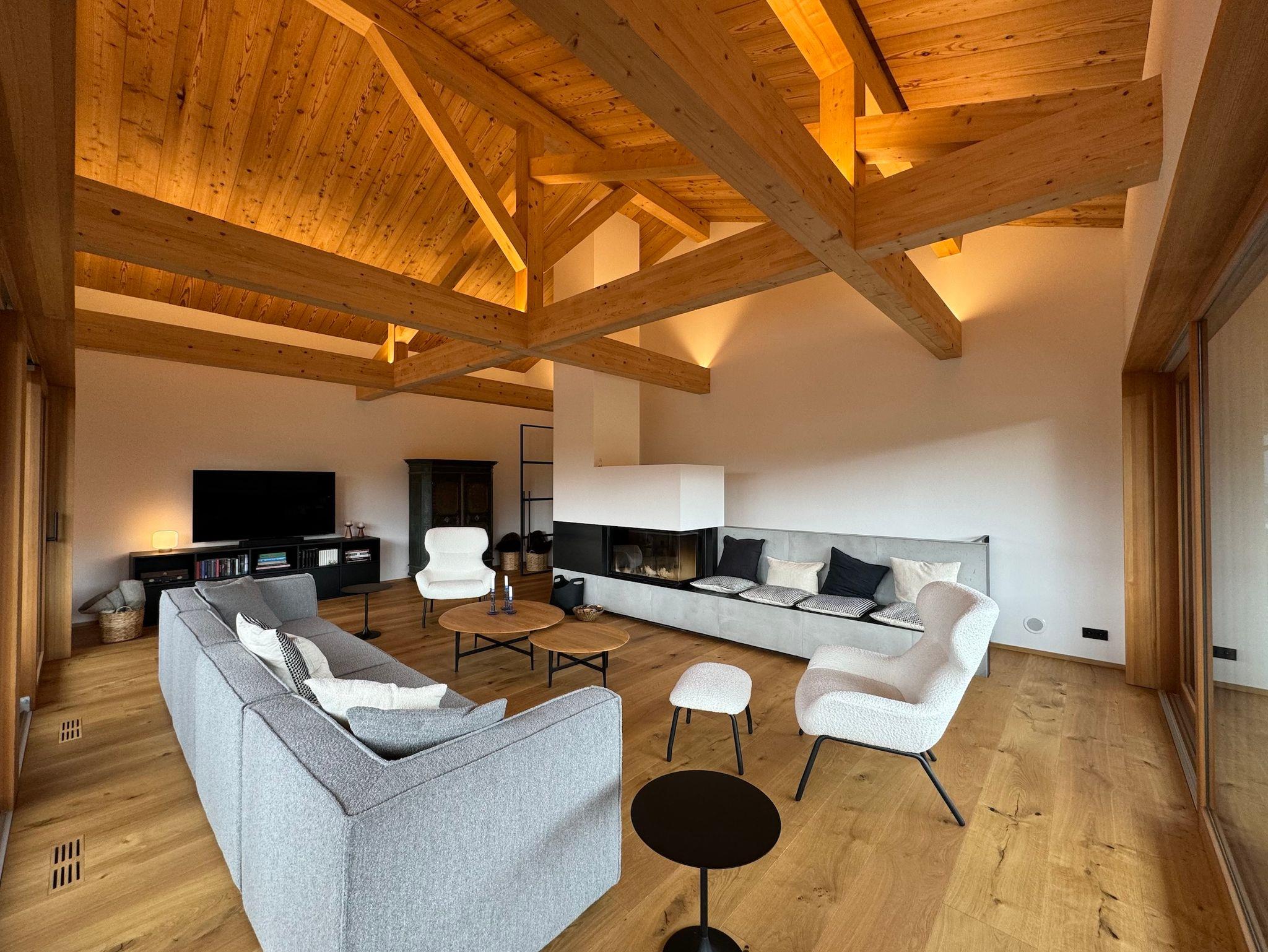 Großzügige 240 qm Wohnfläche bieten viel Platz und Komfort für bis zu acht Gäste. Die luxuriöse, offene Küche mit Theke und großem Esstisch befindet sich im Erdgeschoss. Über große Schiebetüren gelangt man auf die sonnige Terrasse und in den Garten. Das weitläufige Wohnzimmer im Obergeschoss, ebenfalls mit großen Schiebetüren zum umlaufenden Balkon, bietet viele gemütliche Sitzmöglichkeiten, einen großen Kamin mit Kaminbank und besticht durch die enorme Raumhöhe in das offene Gebälk des Dachstuhls. Vier Schlafzimmer, drei Badezimmer und ein Gäste-WC verteilen sich auf die beiden Etagen des Ferien-Chalets. Komplettiert wird die grosszügige und luxuriöse Ausstattung durch eine große finnische Sauna im Obergeschoss, die Doppelgarage mit Wallbox und die über das lokale Naturwärmewerk gespeiste Fußbodenheizung.