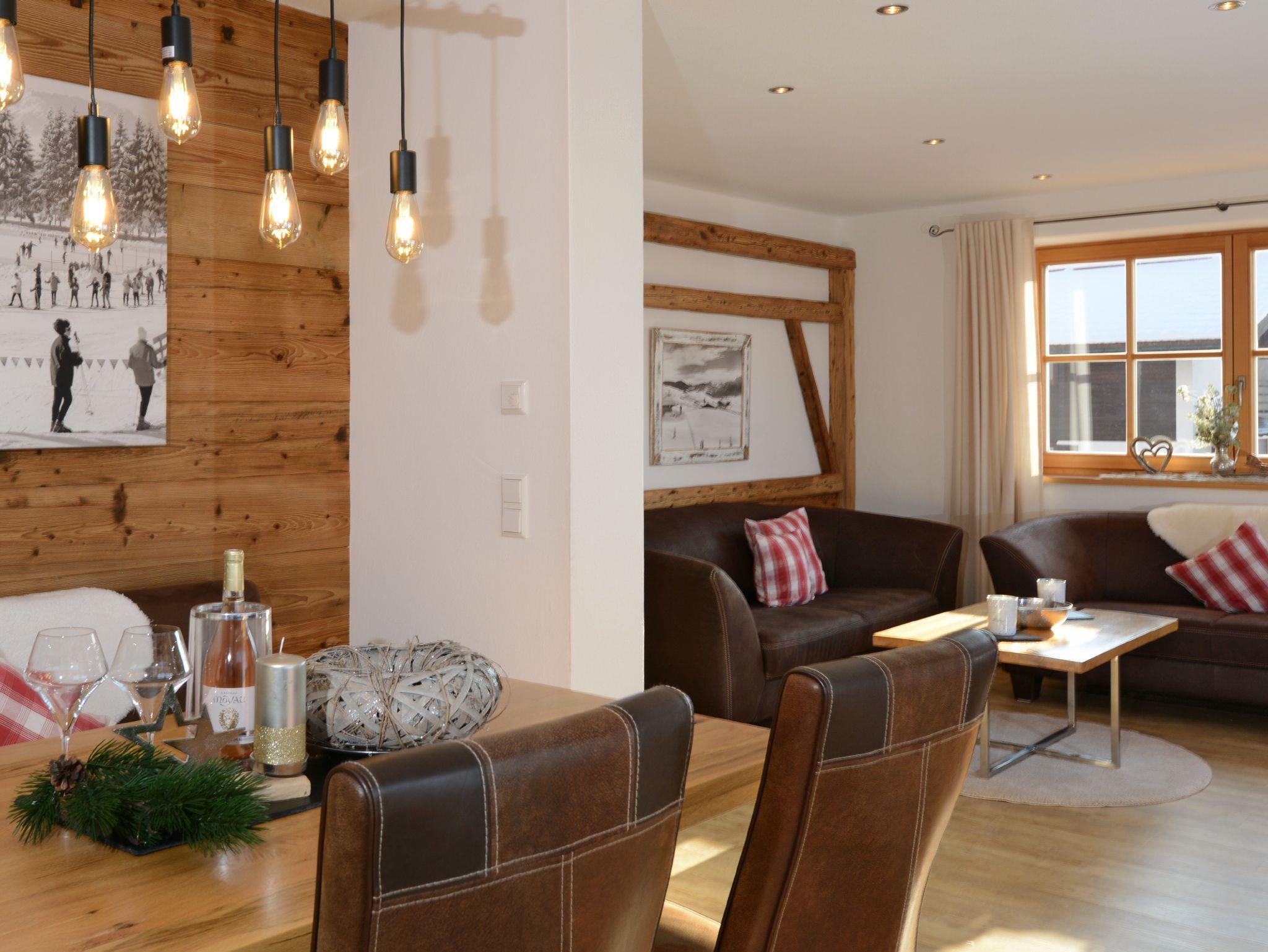 Zwei komfortable Schlafzimmer mit Doppelbett und rustikaler Stadelholzwandgestaltung, Eichenkleiderschrank, HD-Flachbildschirm, Einzelzimmer mit schöner Altholzwandgestaltung, Eichen-Kleiderschrank, HD-Flachbildfernseher, voll ausgestattete, moderne Küche mit angrenzendem Wohnraum inkl. Backofen, Ceranfeld mit vier Feldern, Dunstabzugshaube, Spülmaschine, Kühlschrank inkl. extra Gefrierfach, Mikrowelle, Toaster, Wasserkocher, Filter-Kaffeemaschine, Eierkocher, Wohnraum mit gemütlicher Sofaecke, HD- Flachbildschirm mit Kabelanschluss, kostenloses WLAN, 1x Badezimmer mit ebenerdiger Regen- und Handdusche, Waschtisch, Bio-Zedernholz-Infrarotwärmekabine (individuell temperierbar), Fön, Kosmetikspiegel, Handtuchwärmer, Fußbodenheizung, kuschelige Dusch- und Handtücher für den Aufenthalt, 1x Badezimmer mit ebenerdiger Regen- und Handdusche, WC und Waschtisch, Fön, Handtuchwärmer, Fußbodenheizung, Staubsauger, Wolldecken, zweiseitig umlaufender Balkon mit freiem Berg- und Talblick , eigener KFZ- Stellplatz direkt am Haus (1 Stellplatz pro Wohnung)