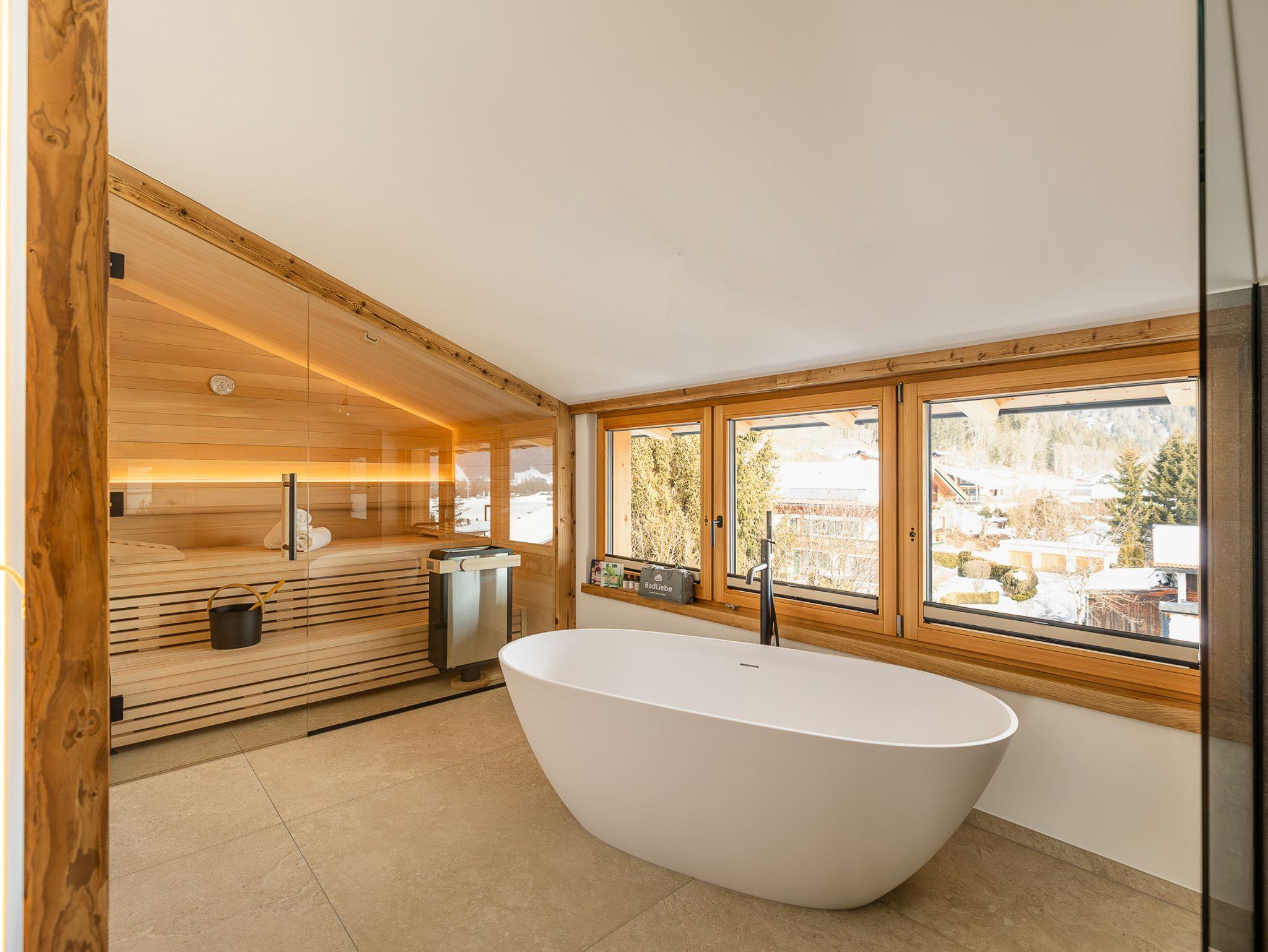 Für weitere Entspannung, bietet der Wellnessraum mit einer traditionellen finnischen Sauna, freistehender Badewanne & angenehmer Beleuchtung die perfekte Voraussetzung zum Abschalten.