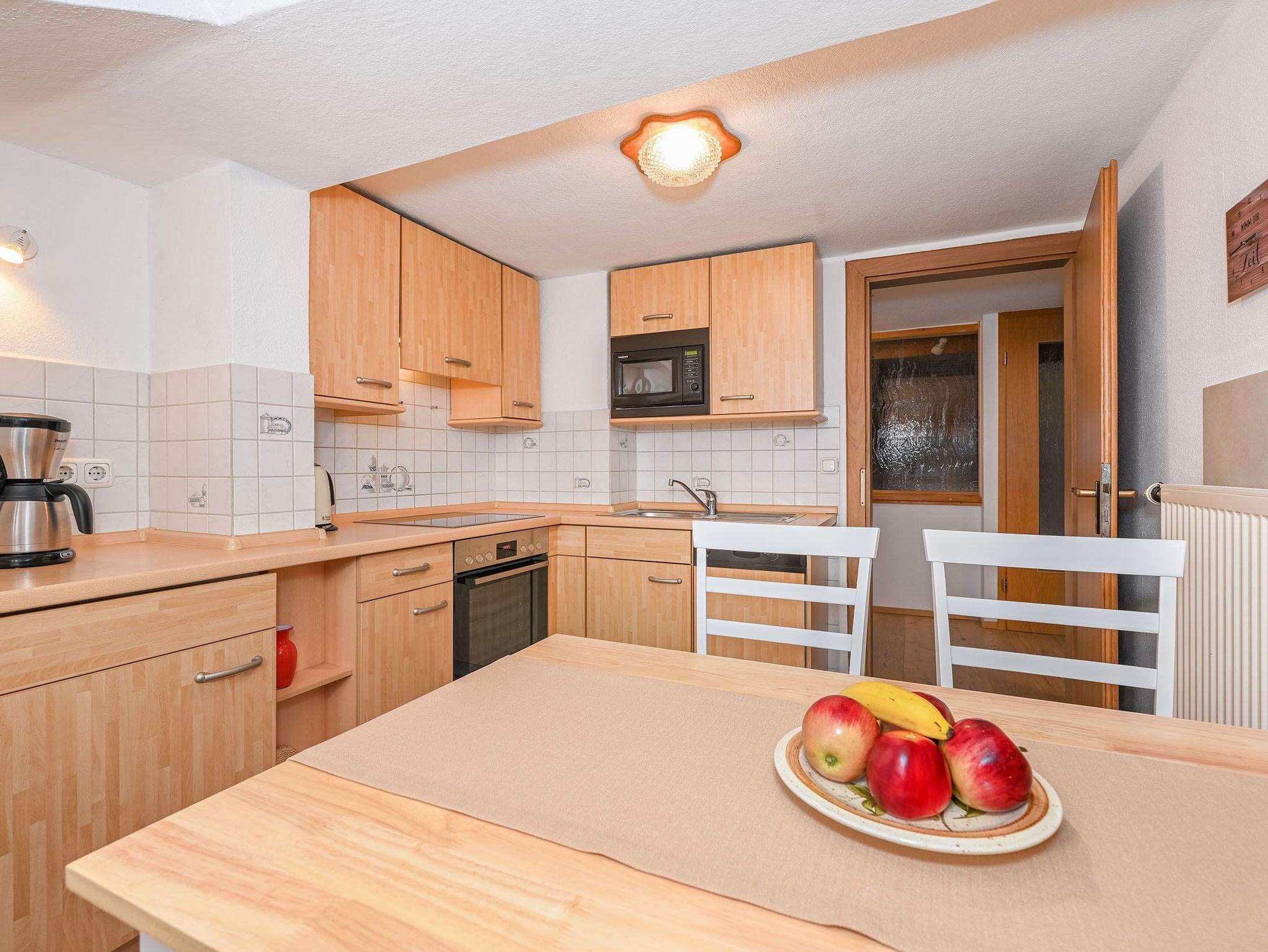 Komplett ausgestattete Wohnküche mit Essecke, Geschirrspülmaschine, Elektroherd mit Ceranfeld/ Backofen, Kaffeemaschine, Mikrowelle, Toaster, Wasserkocher, Dunstabzug, und Radio mit CD-Player.