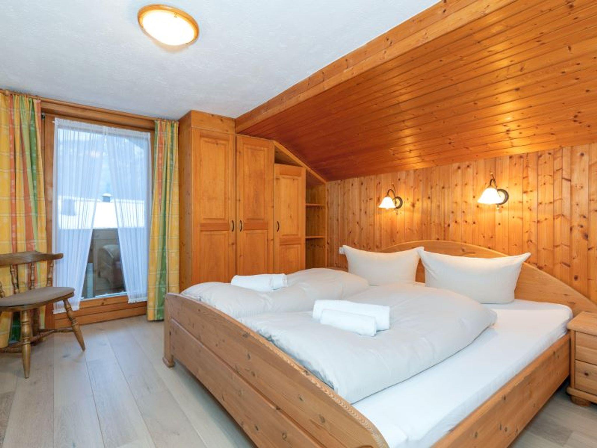 1 Schlafzimmer mit Doppelbett und Ostbalkon mit herrlichem Blick in die Berge.