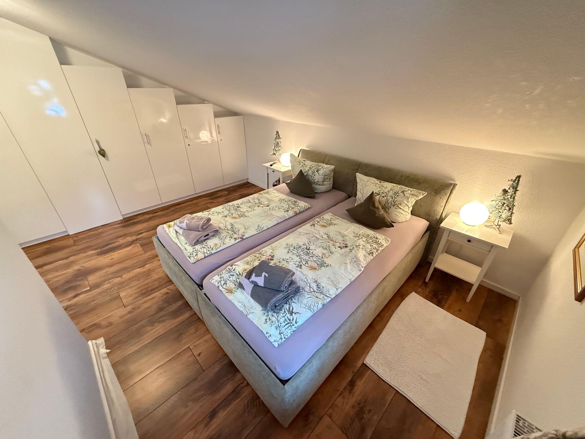 Die Ferienwohnung verfügt über ein Schlafzimmer mit Doppelbett (1,80 x 2,00 m), ein zusätzliches, kleines Zimmer mit Einzelbett (1,00 x 2,00 m),