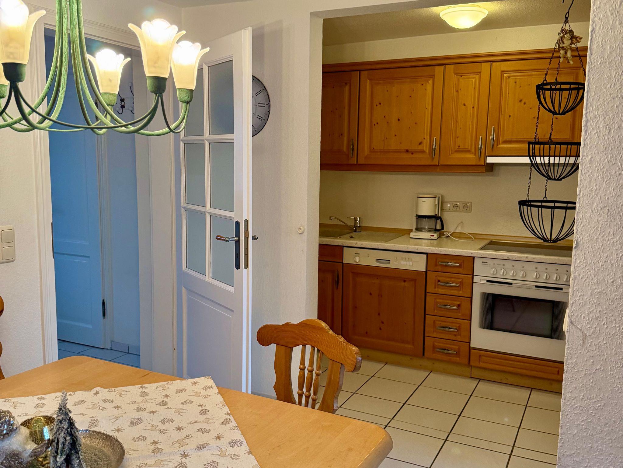 Ferner verfügt die Ferienwohnung über eine Küche mit Spülmaschine, vier Kochfeldern, einem Backofen und einen Kühlschrank sowie einen gemütlichen Kachelofen.