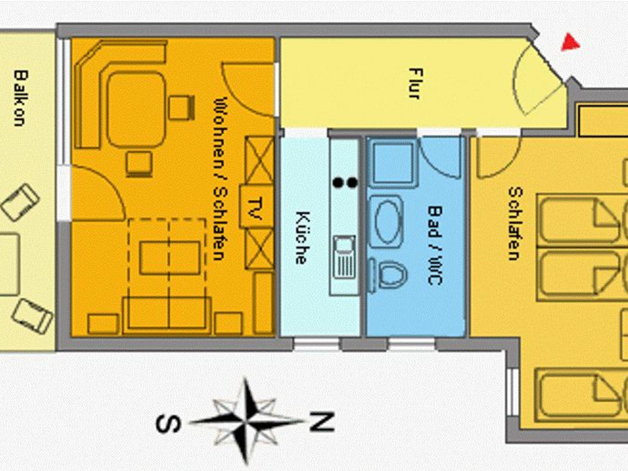 Diese Zwei-Raum-Wohnung mit 53 m² bietet Platz für 2-5 Personen. Der Wohnraum kann als zusätzliches Schlafzimmer (Federkernsofa) für 2 weitere Personen genutzt werden. Eine gemütliche Sitzecke lädt zum verweilen ein. Das separate Schlafzimmer ist mit einem Doppelbett und einem Einzelbett eingerichtet. Die separate Küche ist ausgestattet mit Mikrowelle und Spülmaschine. Der große Südbalkon bietet einen freien Blick in die wunderschöne Bergwelt. Die Ausstattung wird komplettiert mit Dusche/WC, Kabel-TV und kostenlosem Internetzugang. Einen Grundriss der Wohnung finden Sie auf unserer Homepage.