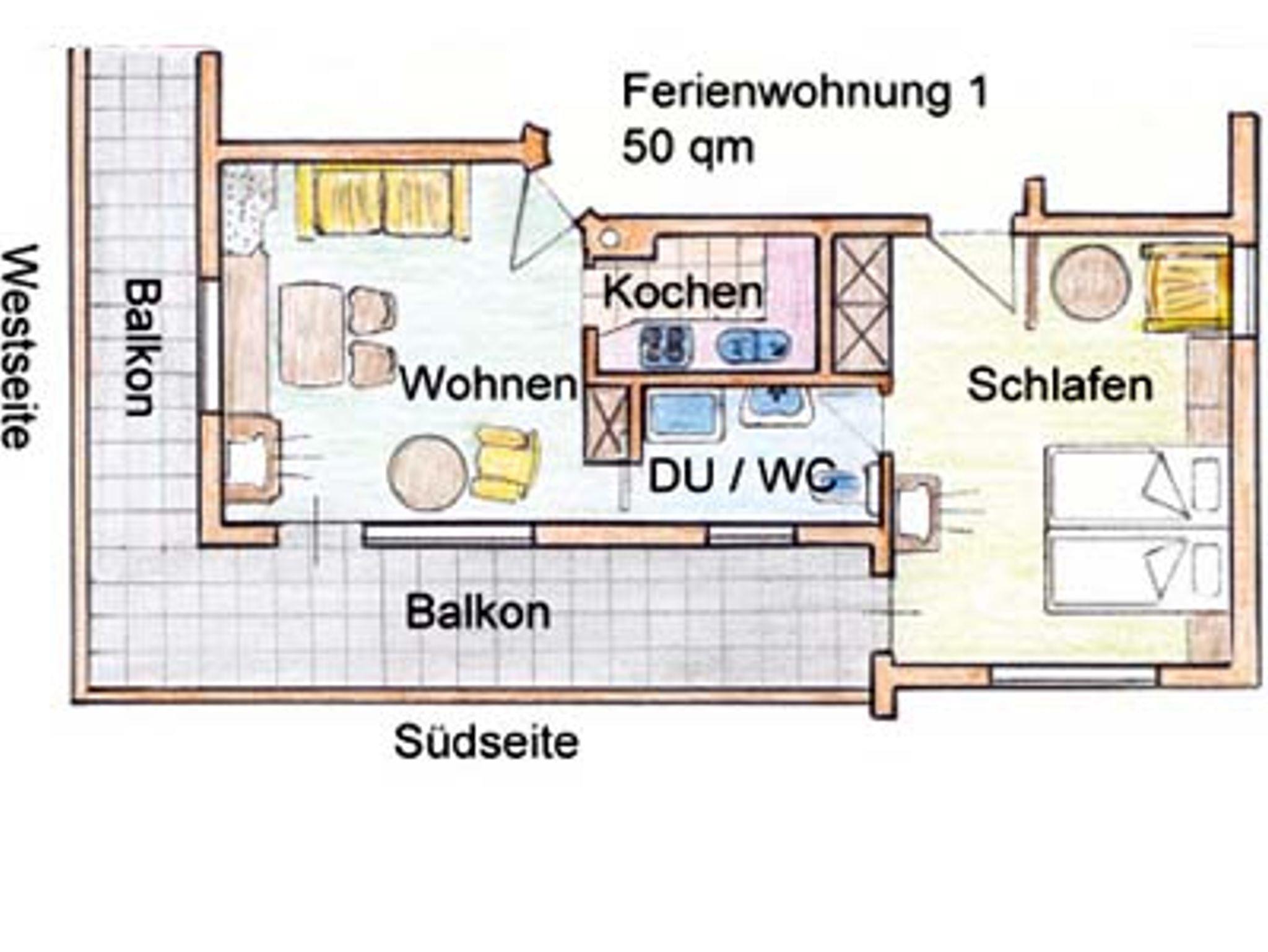 Gästehaus Schmuck, (2)Zwei-Raum-Ferienwohnung 44qm, Dusche, WC, Extra-Schlafraum, Küchenzeile, Balkon