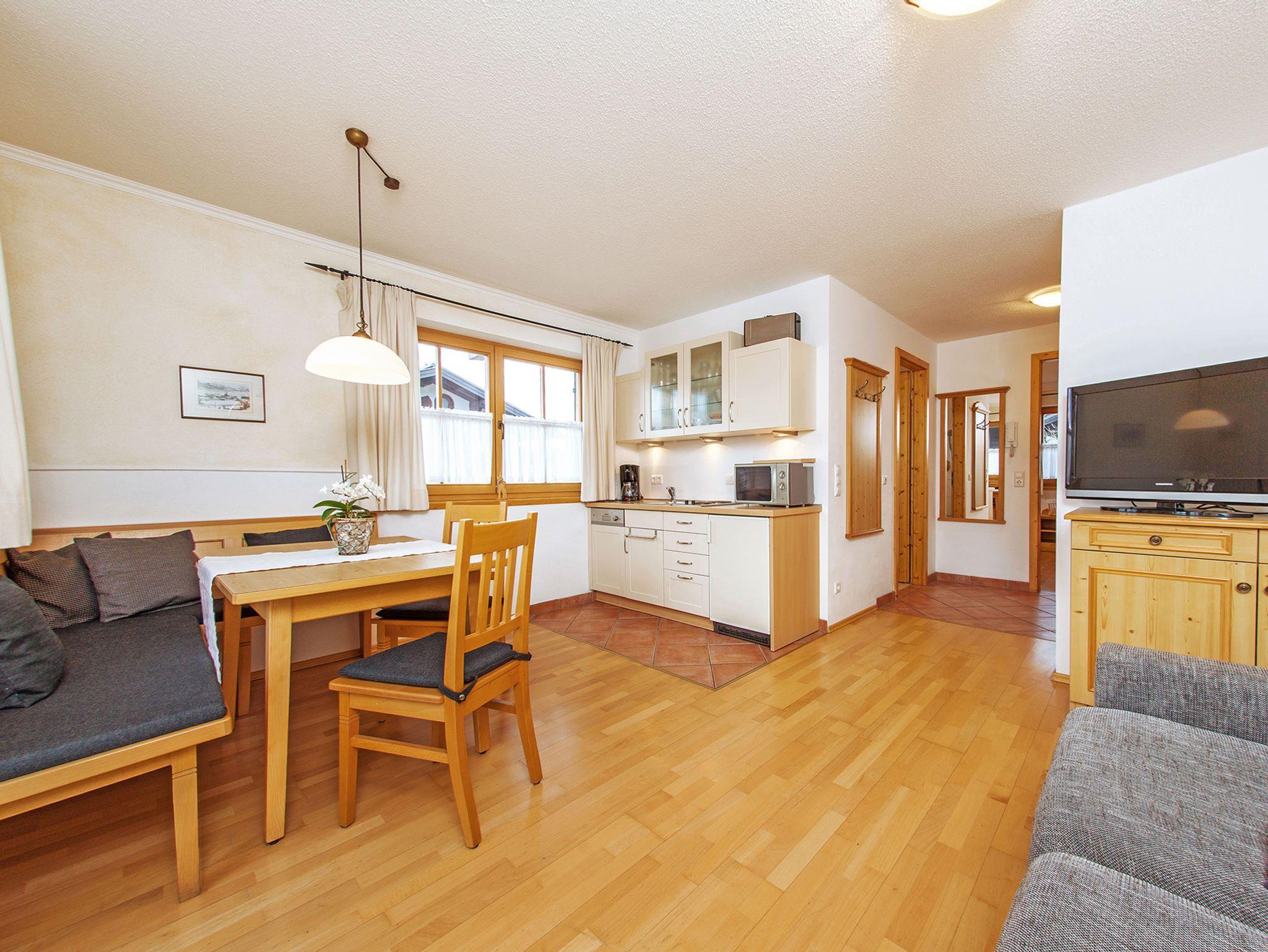 Großzügiges 2-Zimmer-Familien-Appartement im Dachgeschoß hat eine Größe von ca. 43 m². Der große Westbalkon bietet freien Blick ins Kaisergebirge. An der gemütlichen Essecke im Wohnraum können Sie die selbst zubereiteten Mahlzeiten genießen. Die Küchenzeile ist mit einem Geschirrspüler sowie Mikrowelle ausgestattet. Allergikergerecht wurde in der gesamten Wohnung hochwertiger Parkettboden verlegt. Im Wohnraum lässt sich das Sofa ausklappen und bietet Platz für eine Person. Bettwäsche und Handtücher sind ausreichend vorhanden und werden nach Ihren Wünschen gewechselt. Für den Fernsehabend steht Ihnen ein DVD-Player sowie ein Fernsehgerät in Wohn- und Schlafzimmer zur Verfügung. In unseren Badezimmern bekommen Sie keine kalten Füße! Dafür sorgt die ganzjährig beheizte Fußbodenheizung.