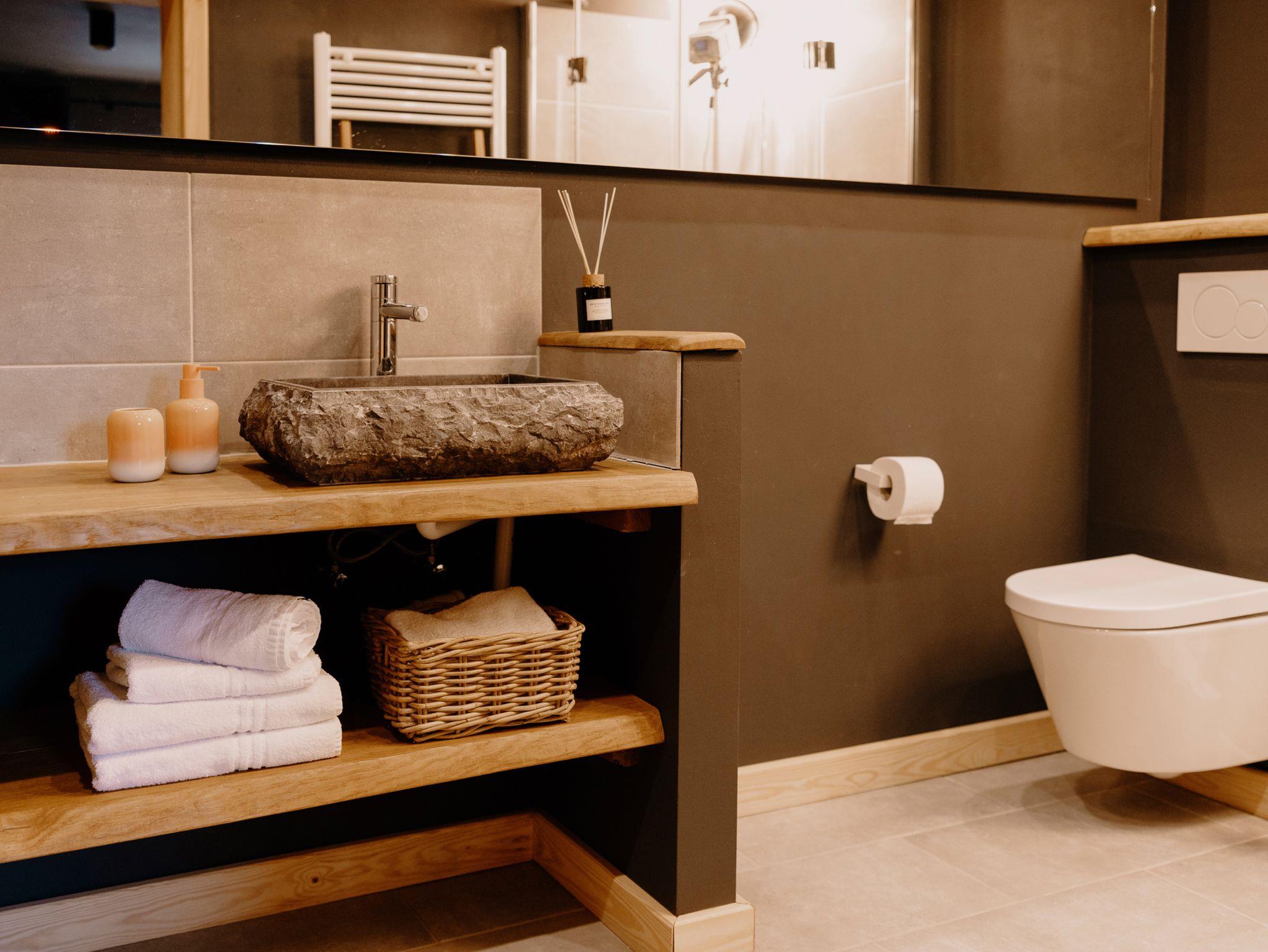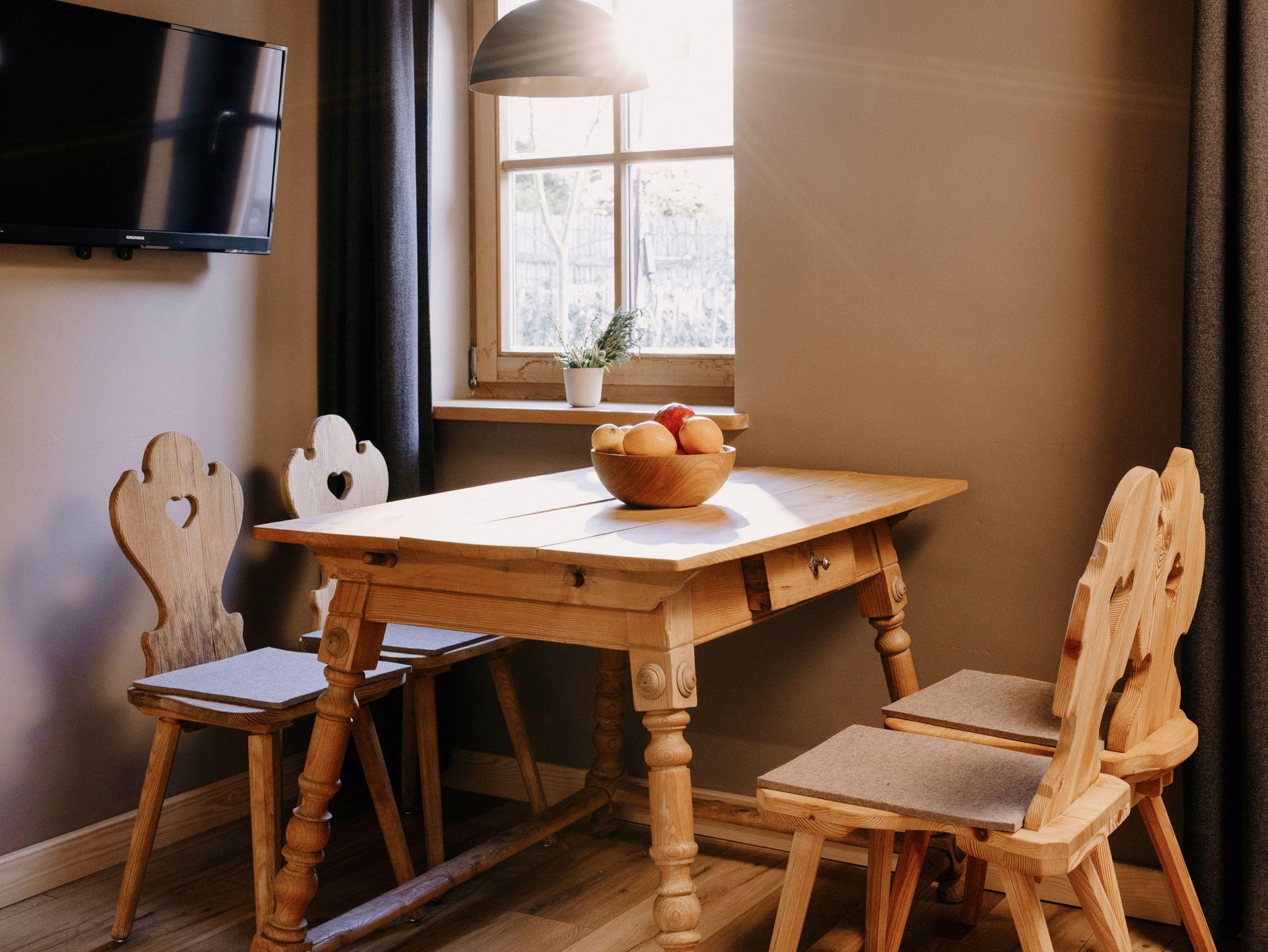 Das stilvolle Apartment im modernen Landhausstil besteht aus einem Wohnraum mit gut ausgestatteter Küchenzeile, Sitzecke und Schlaf-Sofa (120x200), einem Schlafzimmer mit Doppelbett (180x200), zwei Flat-Screen-TVs, einem alten Bauernschrank und einem modernen Bad mit Dusche, Fußbodenheizung, Handtuch-Heizkörper, großem Spiegel und Steinwaschbecken.