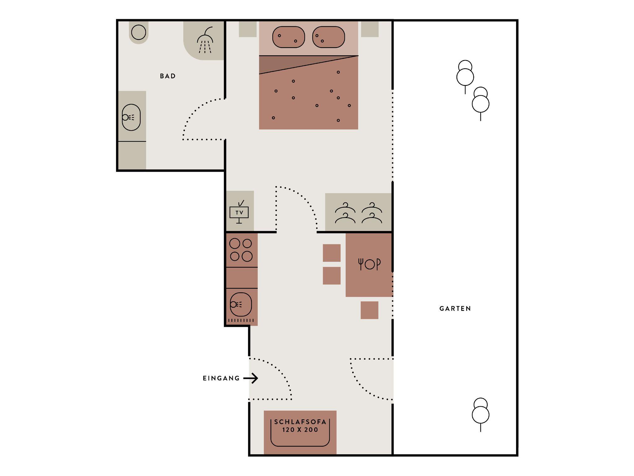 Das Apartment liegt im Erdgeschoss, verfügt über eine möblierte Terrasse und einen nach Osten ausgerichteten, privaten Garten. Es ist für zwei Erwachsene oder eine Familie mit ein/zwei kleinen Kindern ausgelegt.