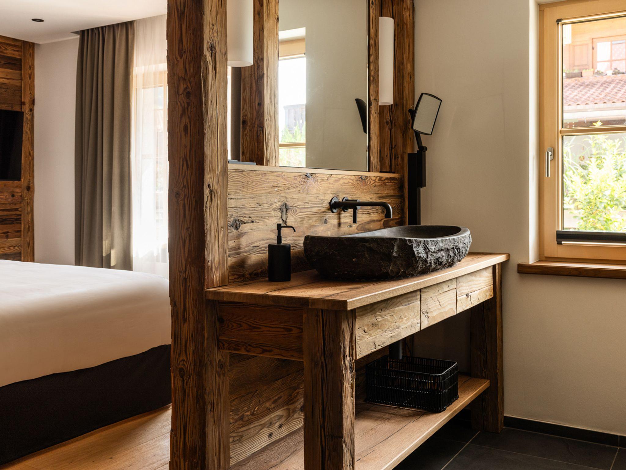 Boxspring-Doppelbett mit Schrank, schwenkbarem TV (digitaler Sat-Empfang), ebenerdiger Regendusche, Waschtisch und separatem WC