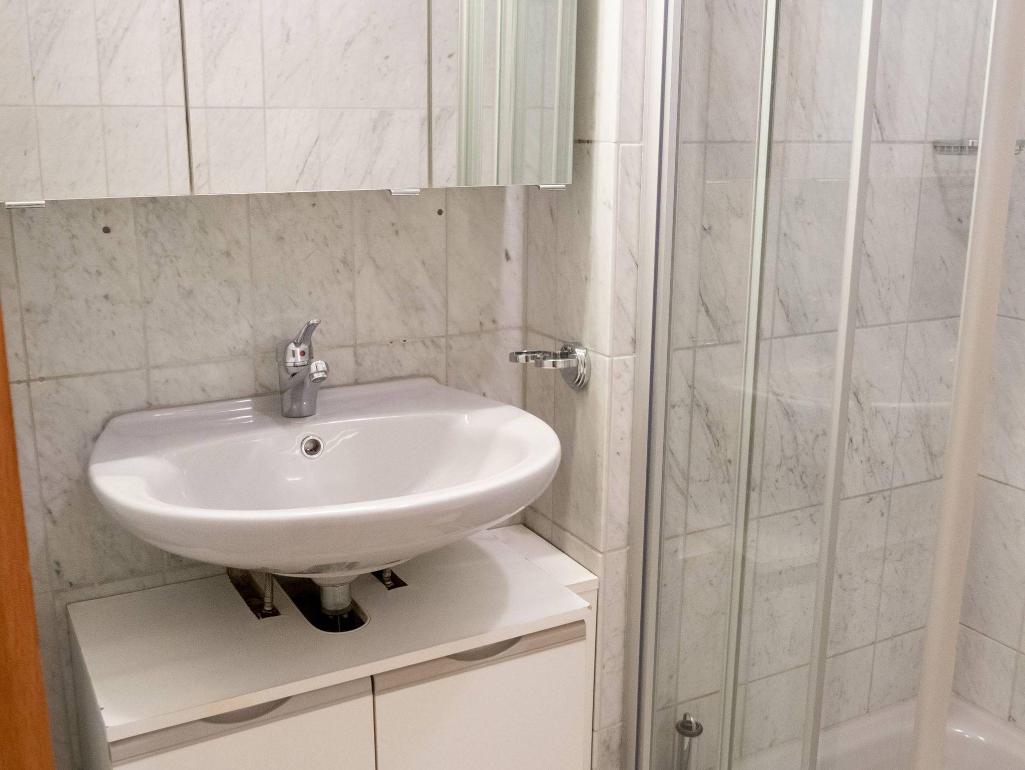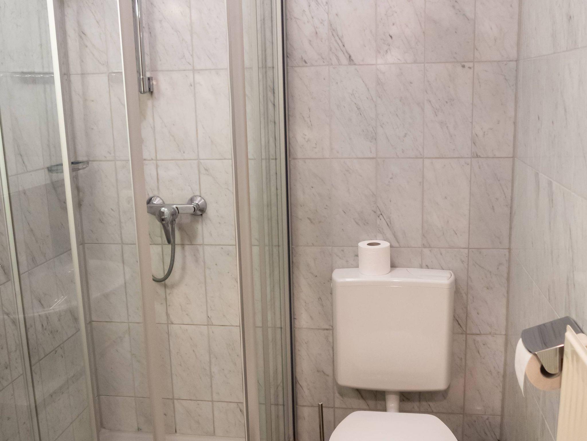 Das Bad ist Dusche und WC ausgestattet und mit italienischem Marmor gefliest – ein optisches Highlight, dass Wertigkeit und Qualität bedeutet.
