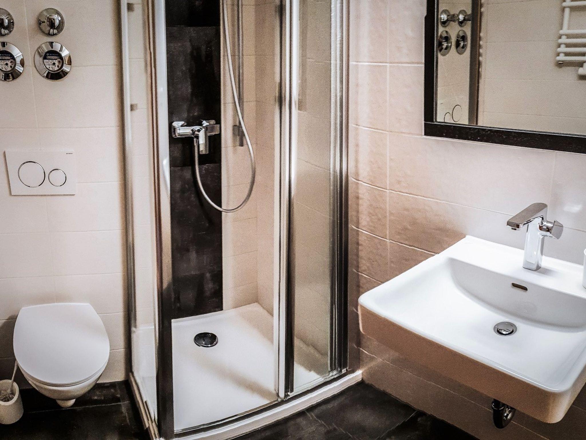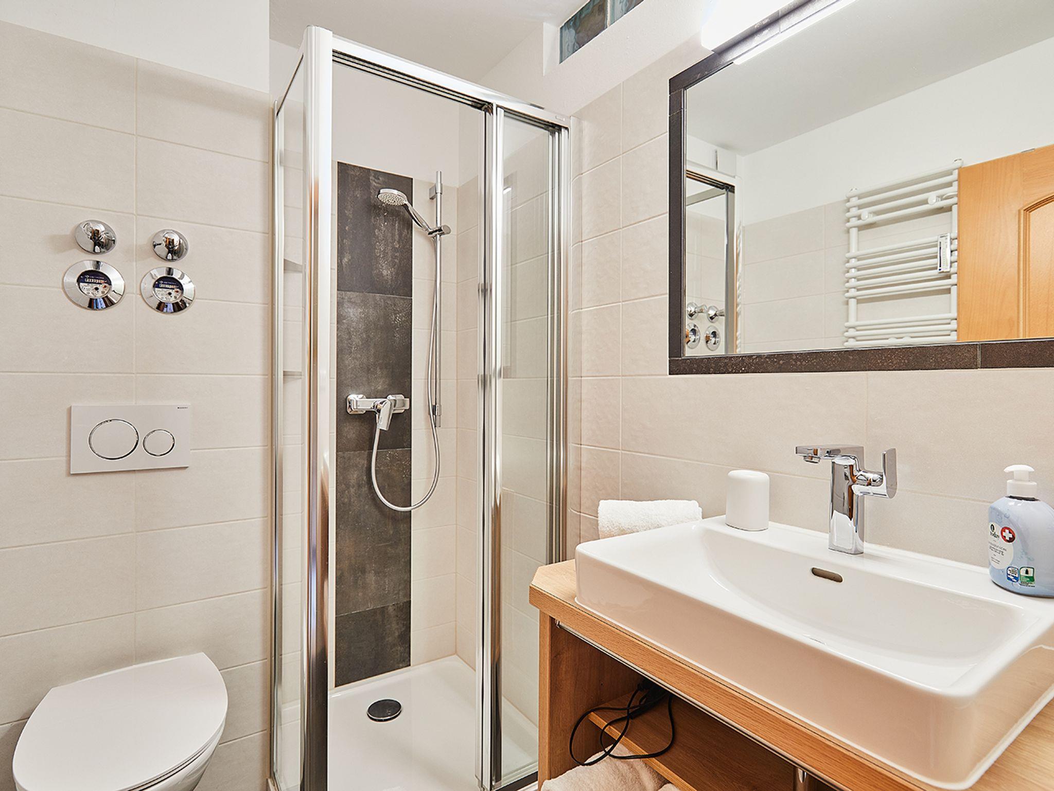 Das moderne Bad verfügt über Dusche, WC, Waschbecken und Haartrockner.