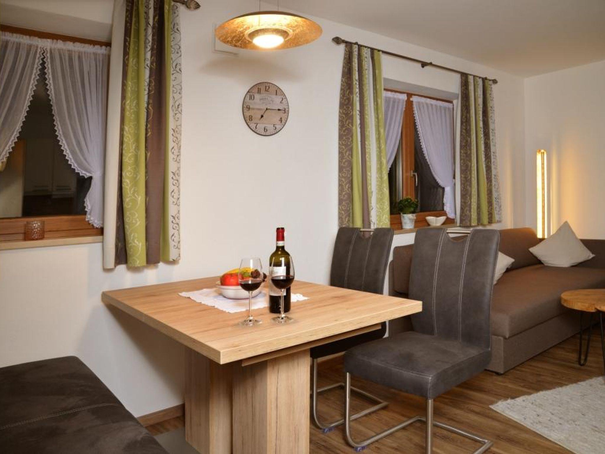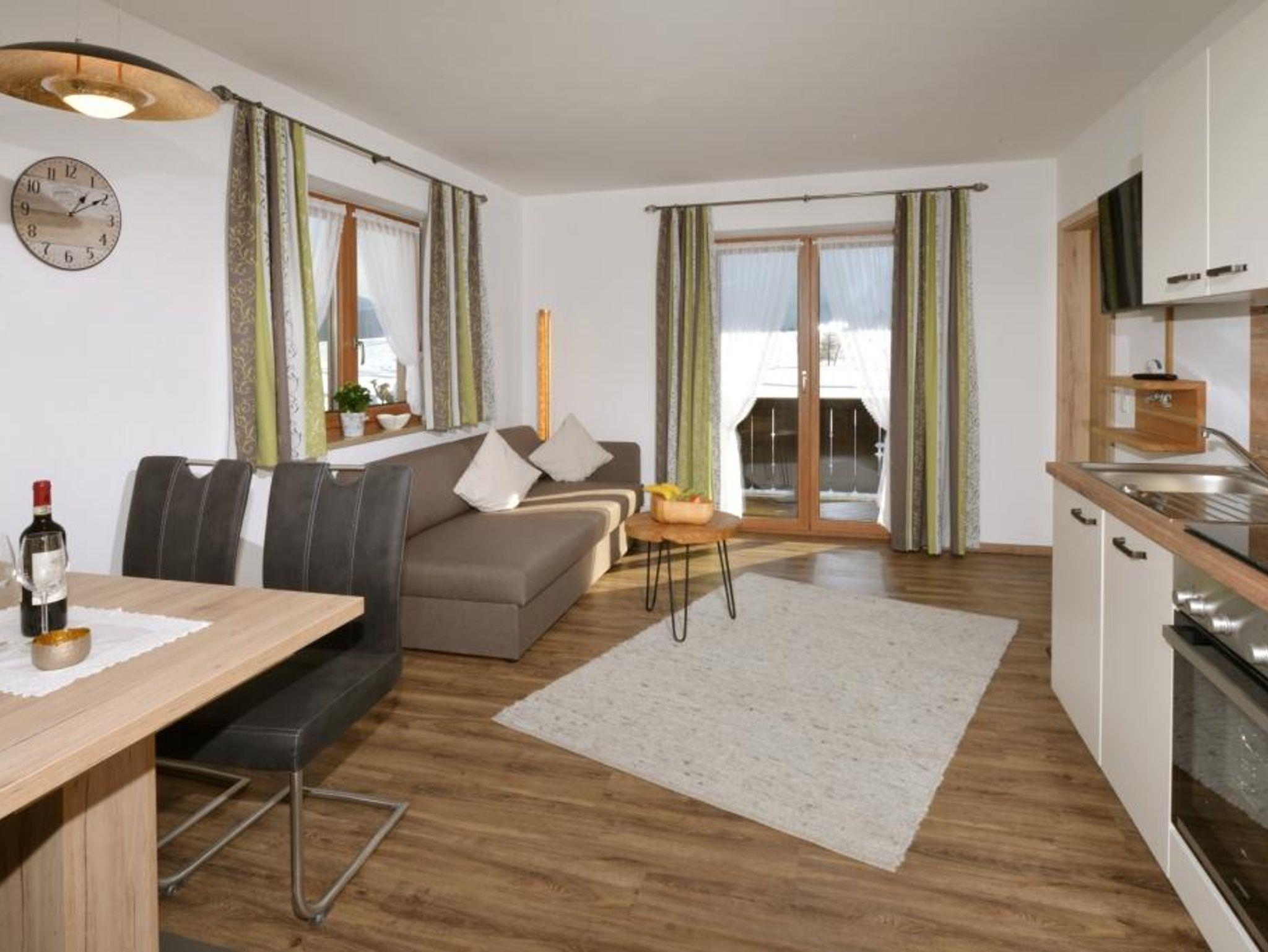 Sehr schöne, helle Neue 2-Raum-Wohnung mit allem Komfort. Gemütliche Wohnküche mit moderner, voll ausgestatteter Küchenzeile, Sitzgruppe und hochwertiger Couch. Ein großer Balkon lädt bei traumhaftem Panoramablick auf die umliegende Bergwelt zum verweilen ein. Das Schlafzimmer ist im ländlichen Stil eingerichtet und sorgt für erholsamen Schlaf.