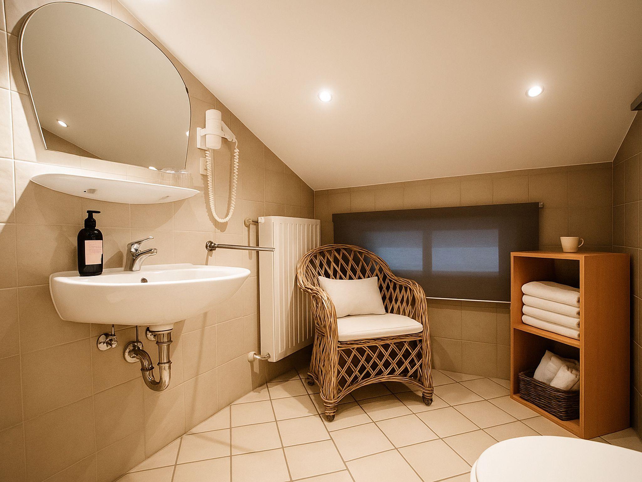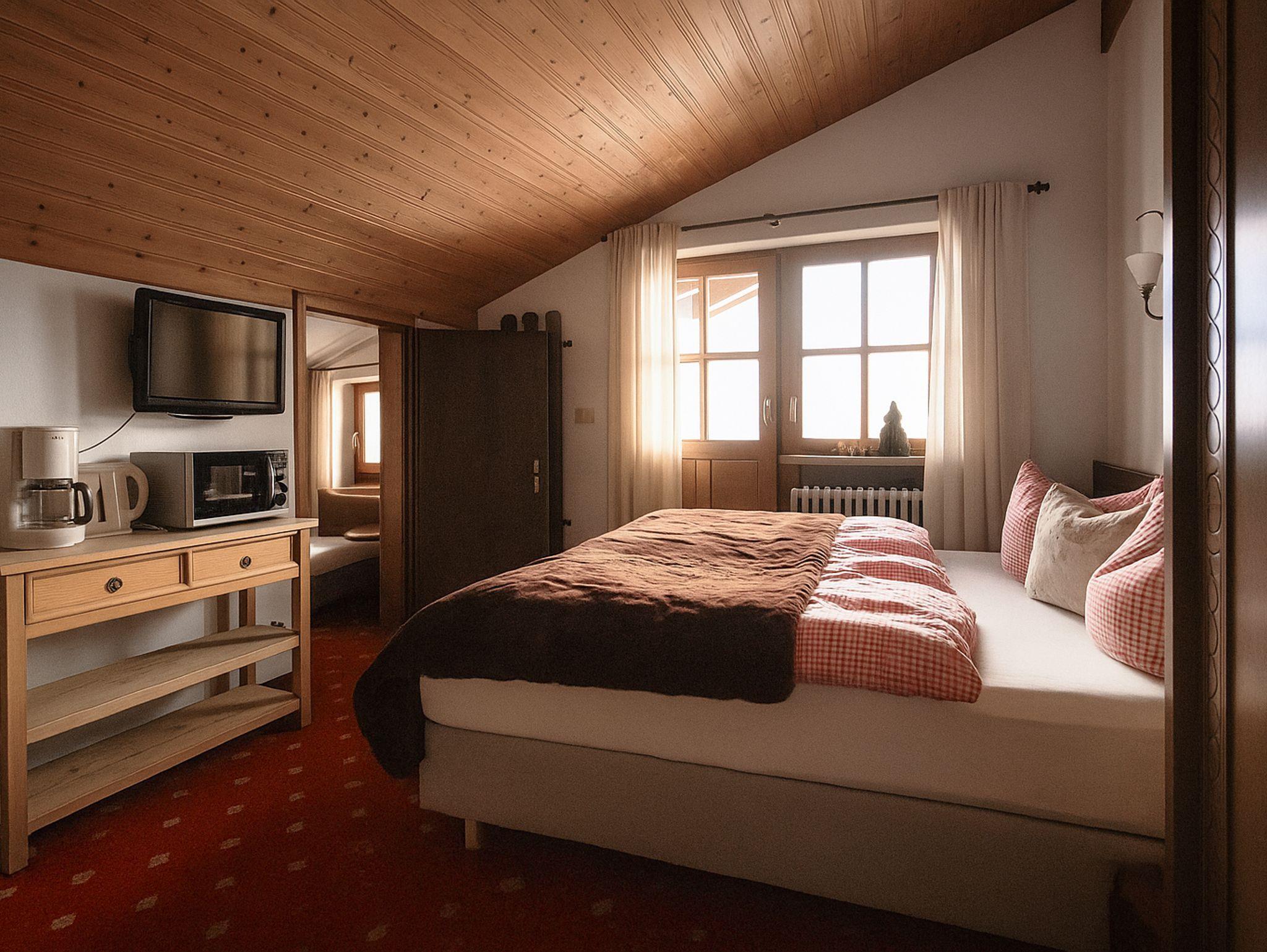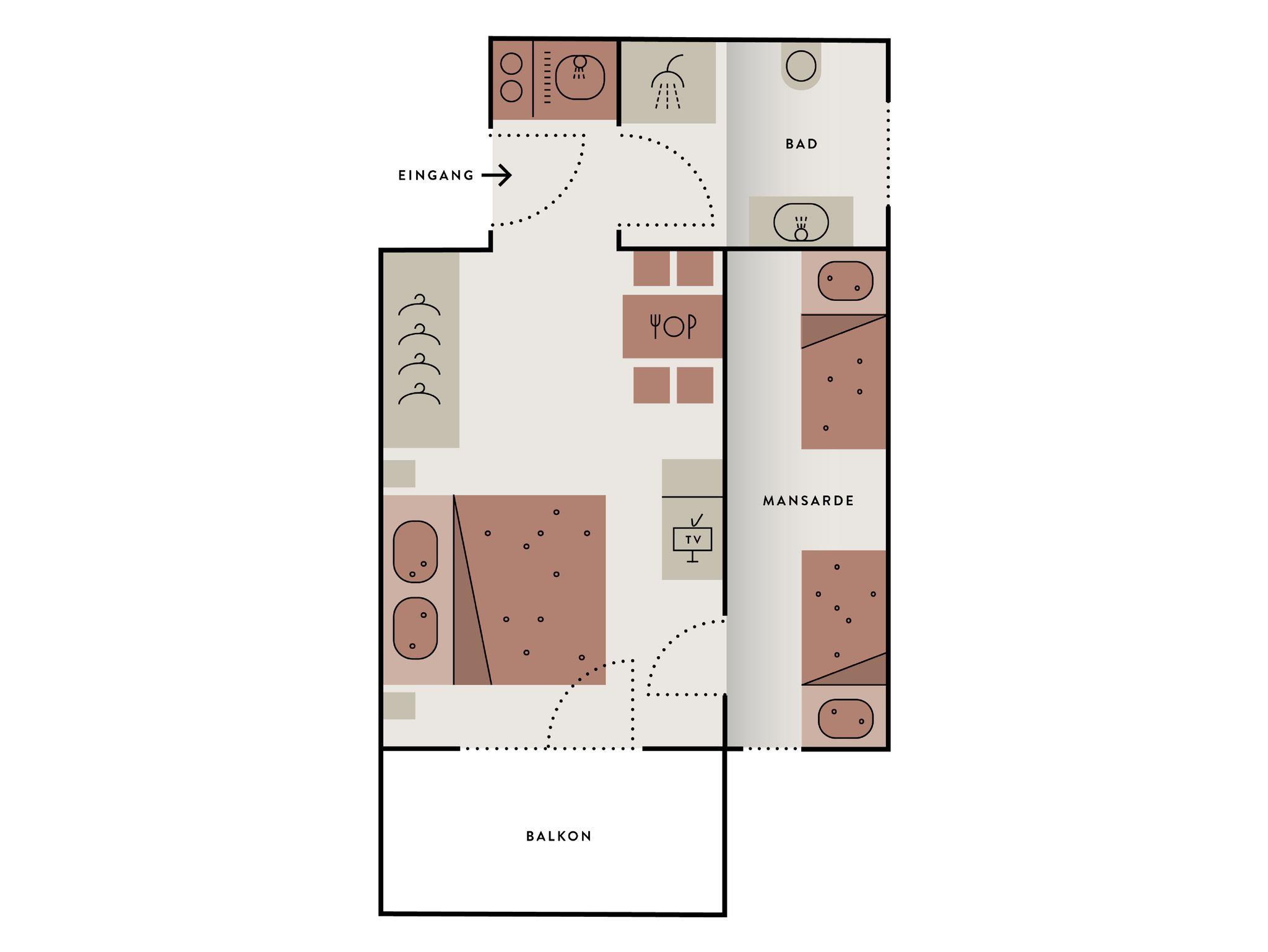 Das nach Süden ausgerichtete Dachgeschoß-Apartment besteht aus einem kombinierten Wohn-Schlafraum mit Doppelbett (180x200), Flat-Screen-TV, Schrank, gemütlicher Sitzgecke, einem separaten Mansardenraum mit zwei Einzelbetten (90x200), einer Mini-Küchenzeile sowie einem Bad mit Dusche.
