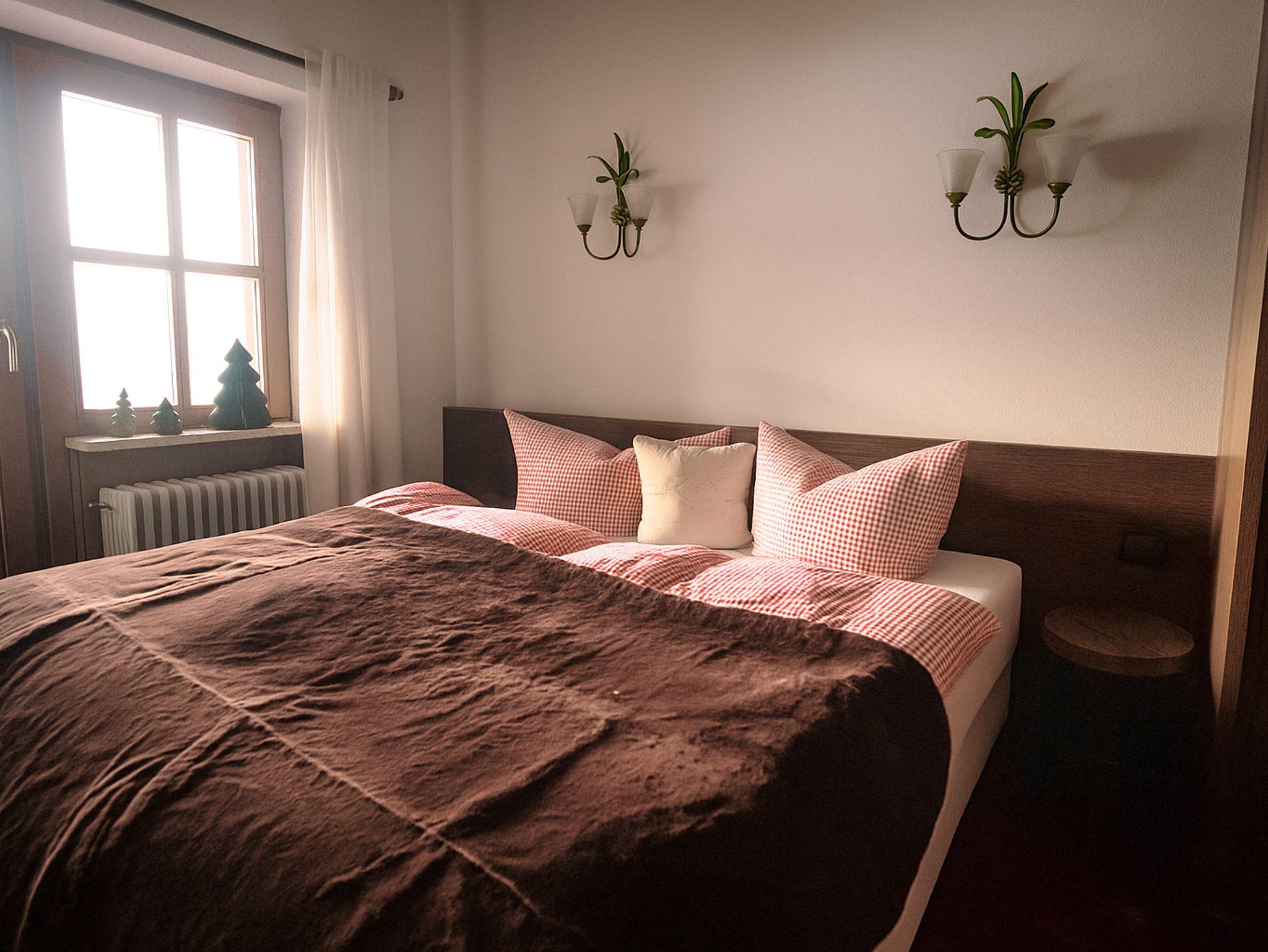 Das Quality-Apartment liegt im zweiten Stock, verfügt über einen möblierten Balkon mit Bergblick auf Fellhorn und Zahmer Kaiser. Es ist ausgelegt für eine Familie mit zwei Kindern oder für vier Personen, die sich nicht an der Dachschräge der Mansarde stören.