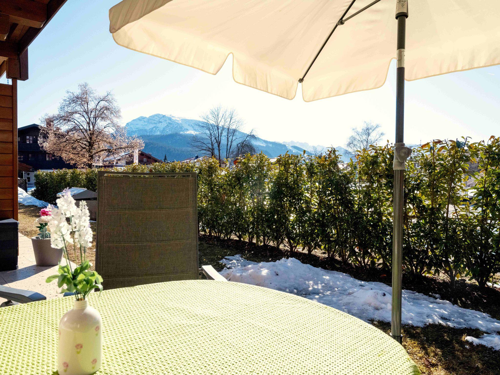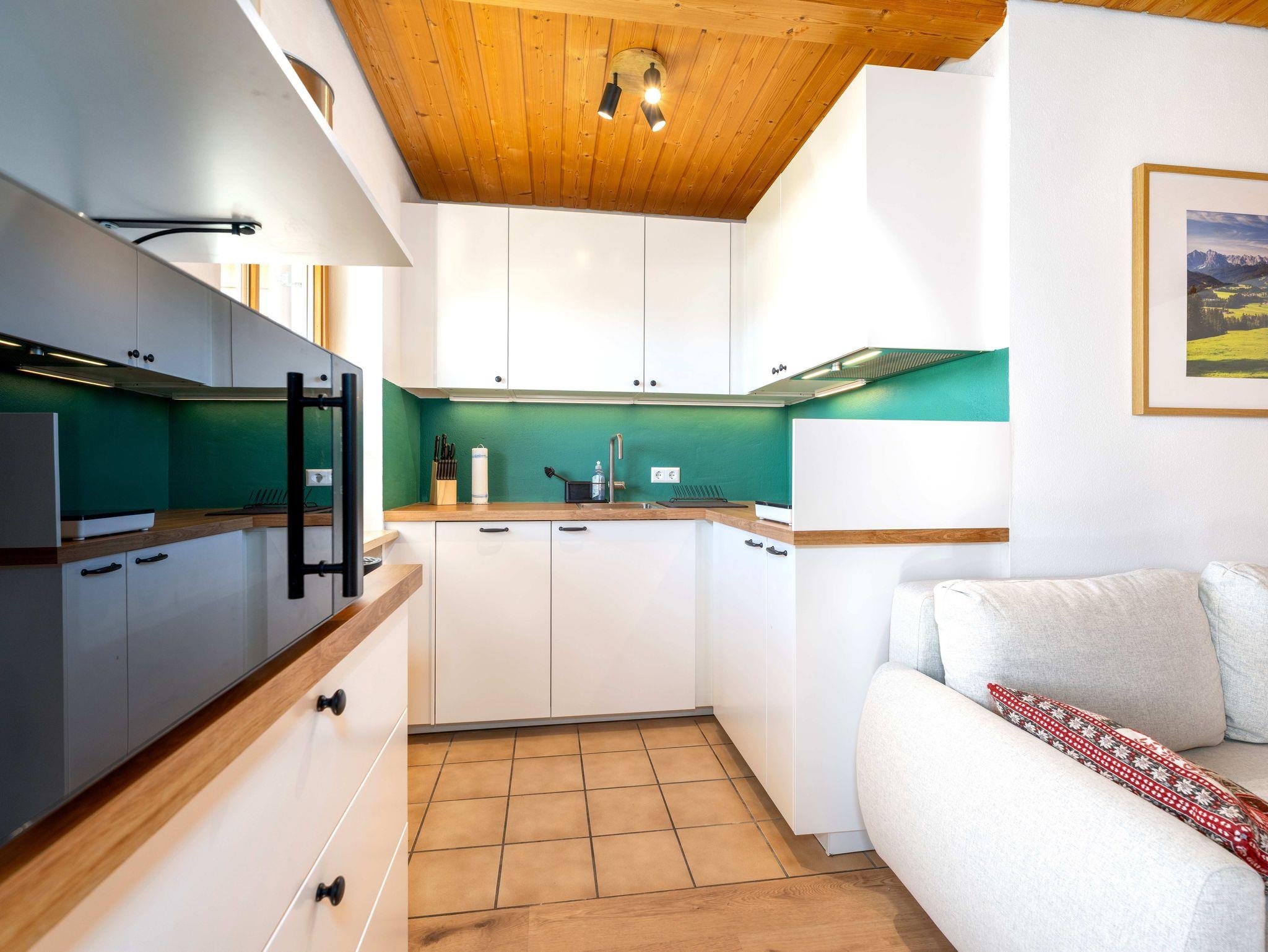 Die Wohnung ‚BergAuszeit‘ bietet ein Schlafzimmer im Souterrain, das auch im Sommer angenehm kühl bleibt, und eine Schlafcouch, die für ein oder zwei weitere Personen Platz bietet. Die moderne Küche lädt zu gemütlichen Kochabenden ein, während die herrliche, nach Westen ausgerichtete Sonnenterrasse mit Bergblick zum Verweilen einlädt – Frühstück mit Ausblick, Kaffee am Nachmittag oder ein Glas Wein bei Sonnenuntergang über dem Kaisergebirge. Die Küche verfügt unter anderem über einen Geschirrspüler, eine Mikrowelle mit Air Fryer-Funktion (Heißluftfritteuse), Induktionskochfeld, Air Fryer (Heißluftfritteuse), und einen Kühlschrank mit TK-Fach.