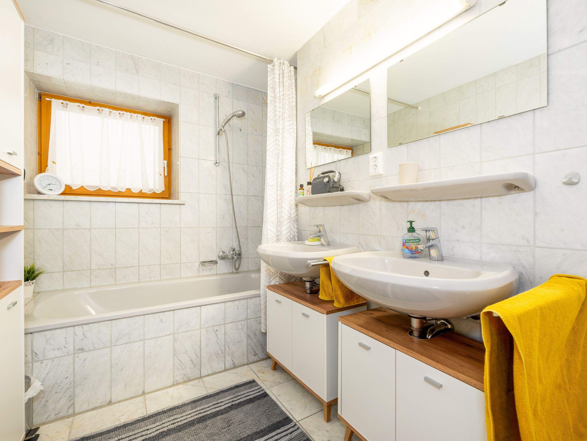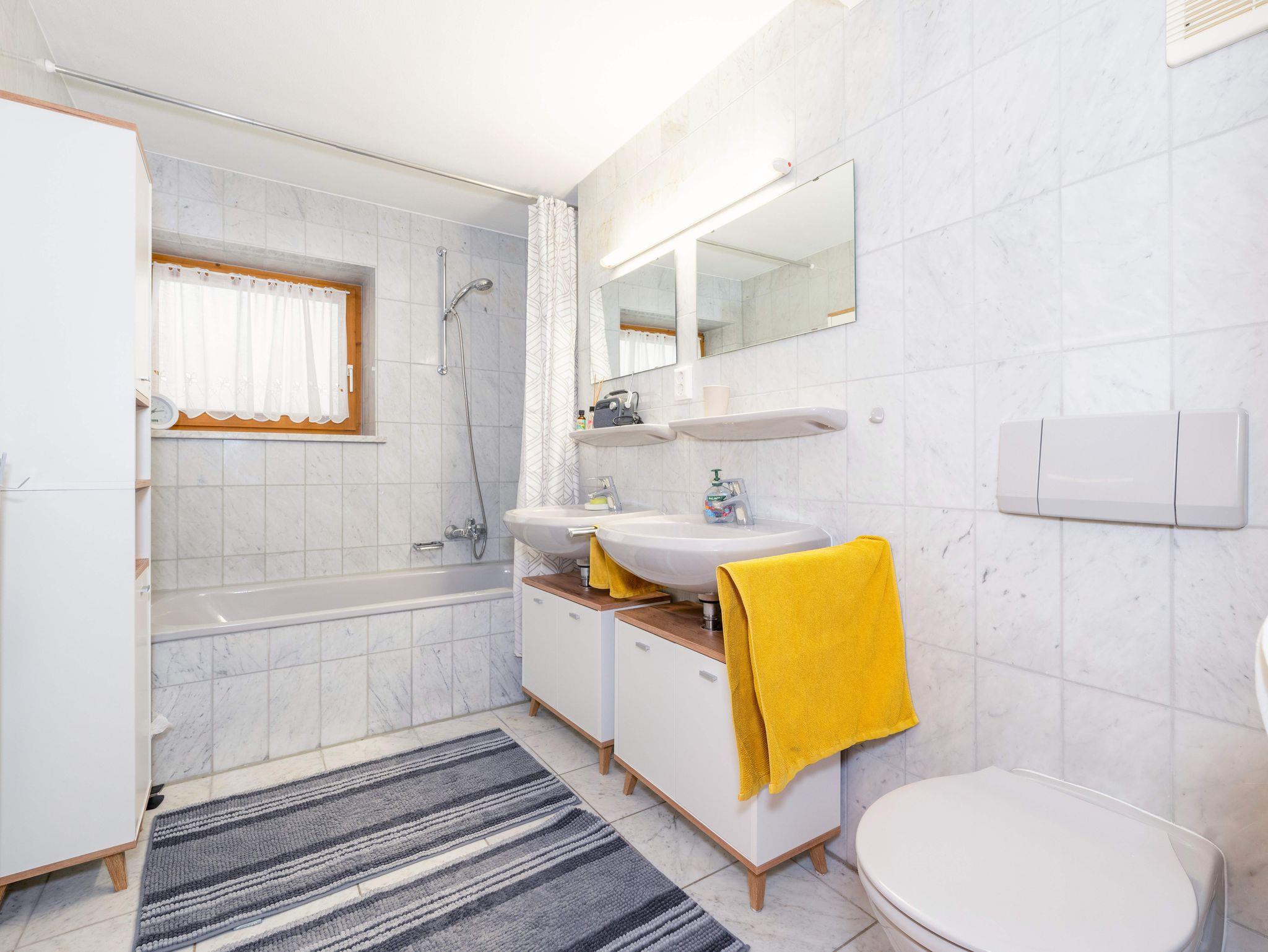 Das funktionell und modern ausgestattete Bad mit einer Duschbadewanne, zwei Waschbecken und einer Toilette bietet Platz für mehrere Personen. Weiterhin befindet sich im Erdgeschoss ein großzügiges Gäste-WC.