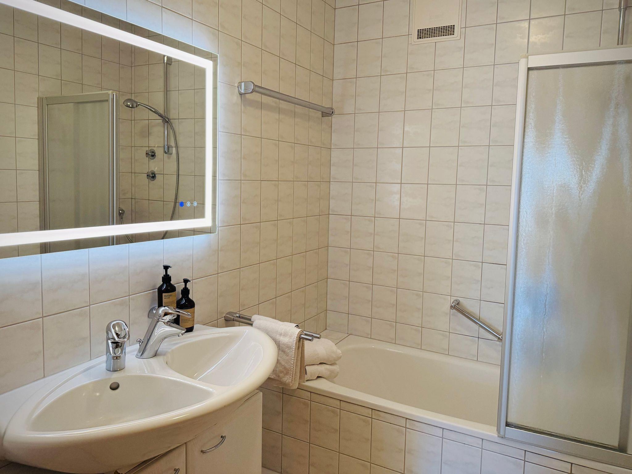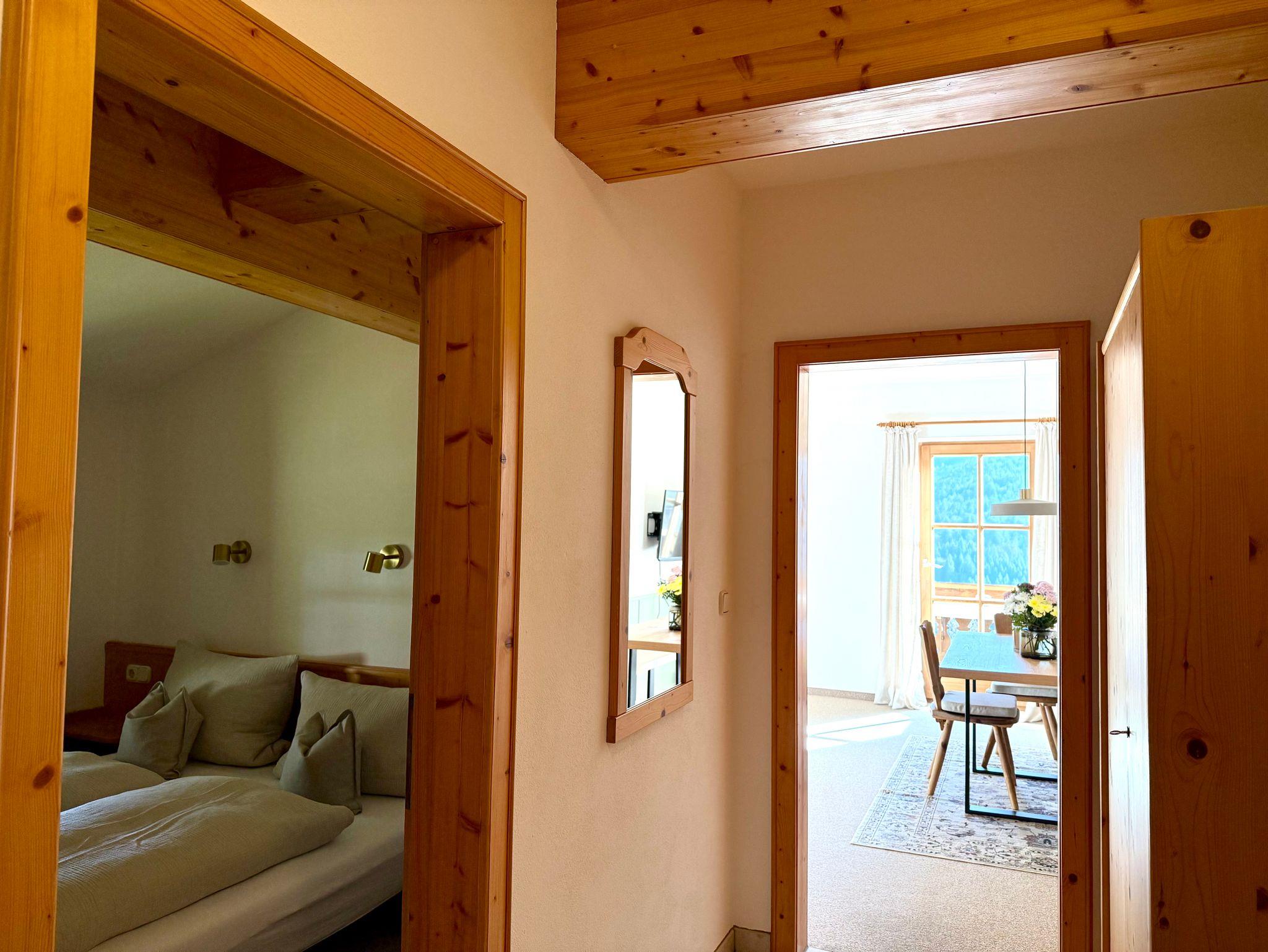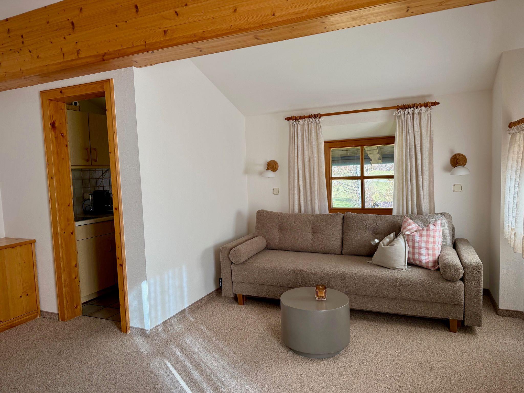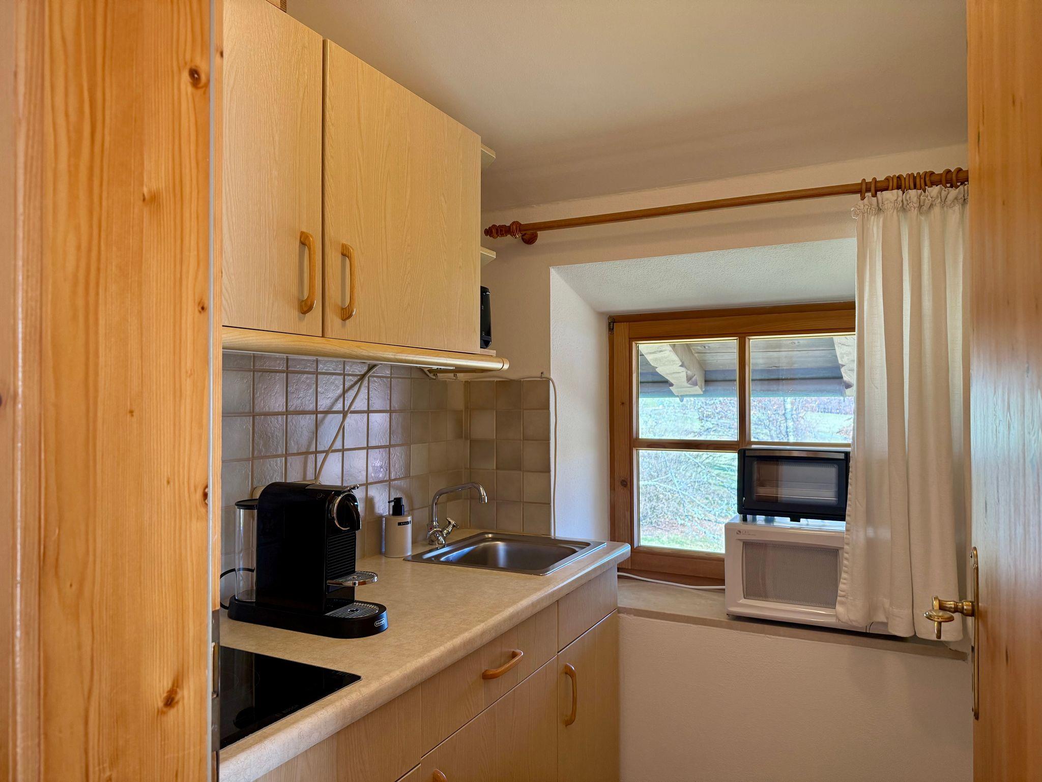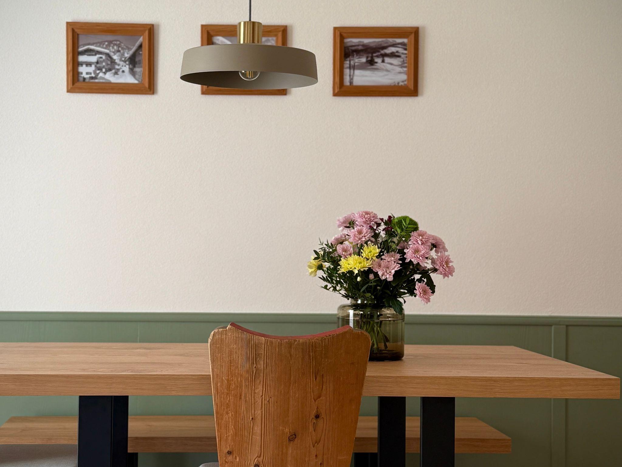 Das Apartment liegt im zweiten Stock, verfügt über einen möblierten Balkon mit Bergblick auf Unterberg, Wilder und Zahmer Kaiser. Es ist ausgelegt für eine Familie mit zwei Kindern oder für vier Personen.