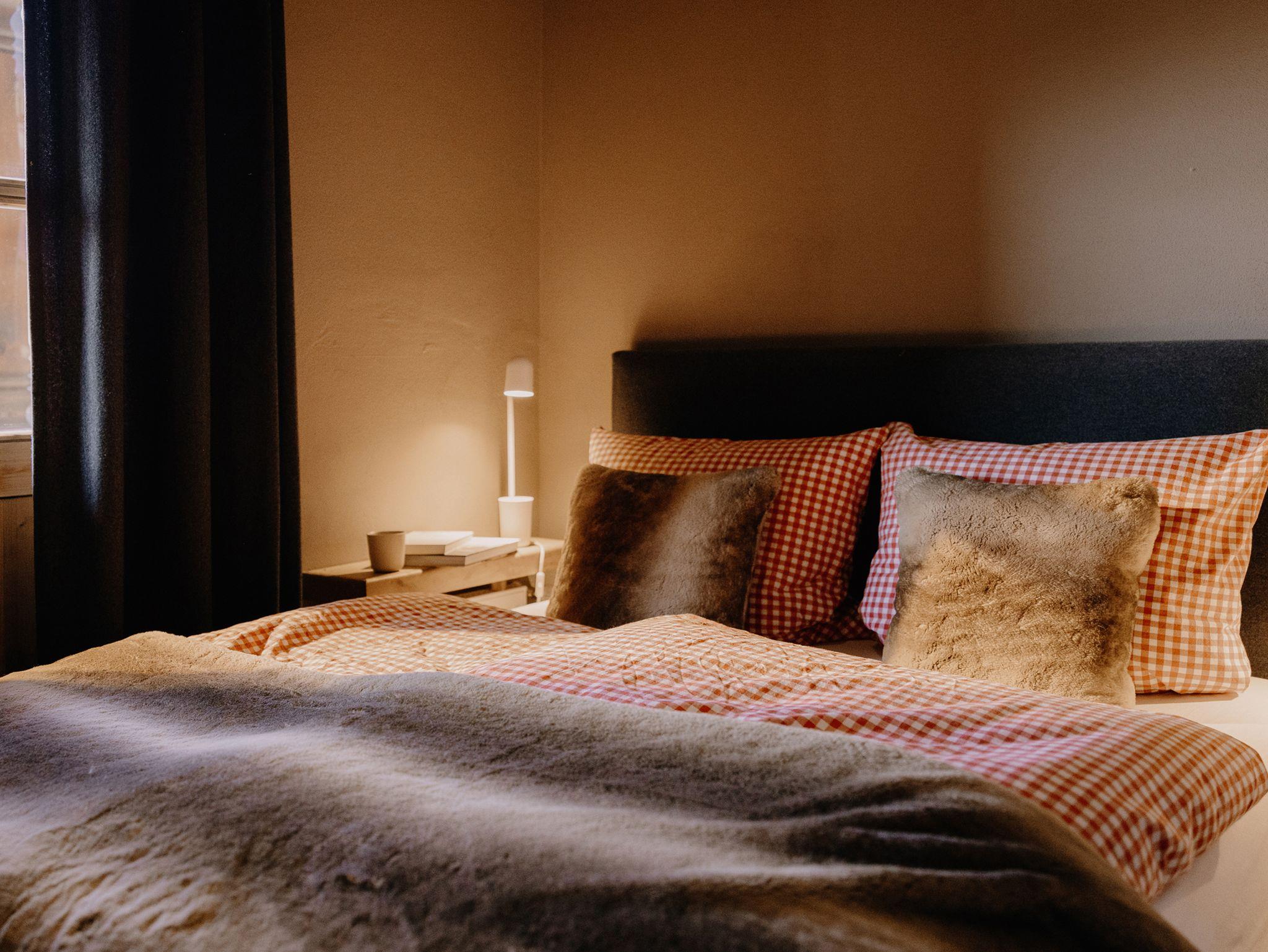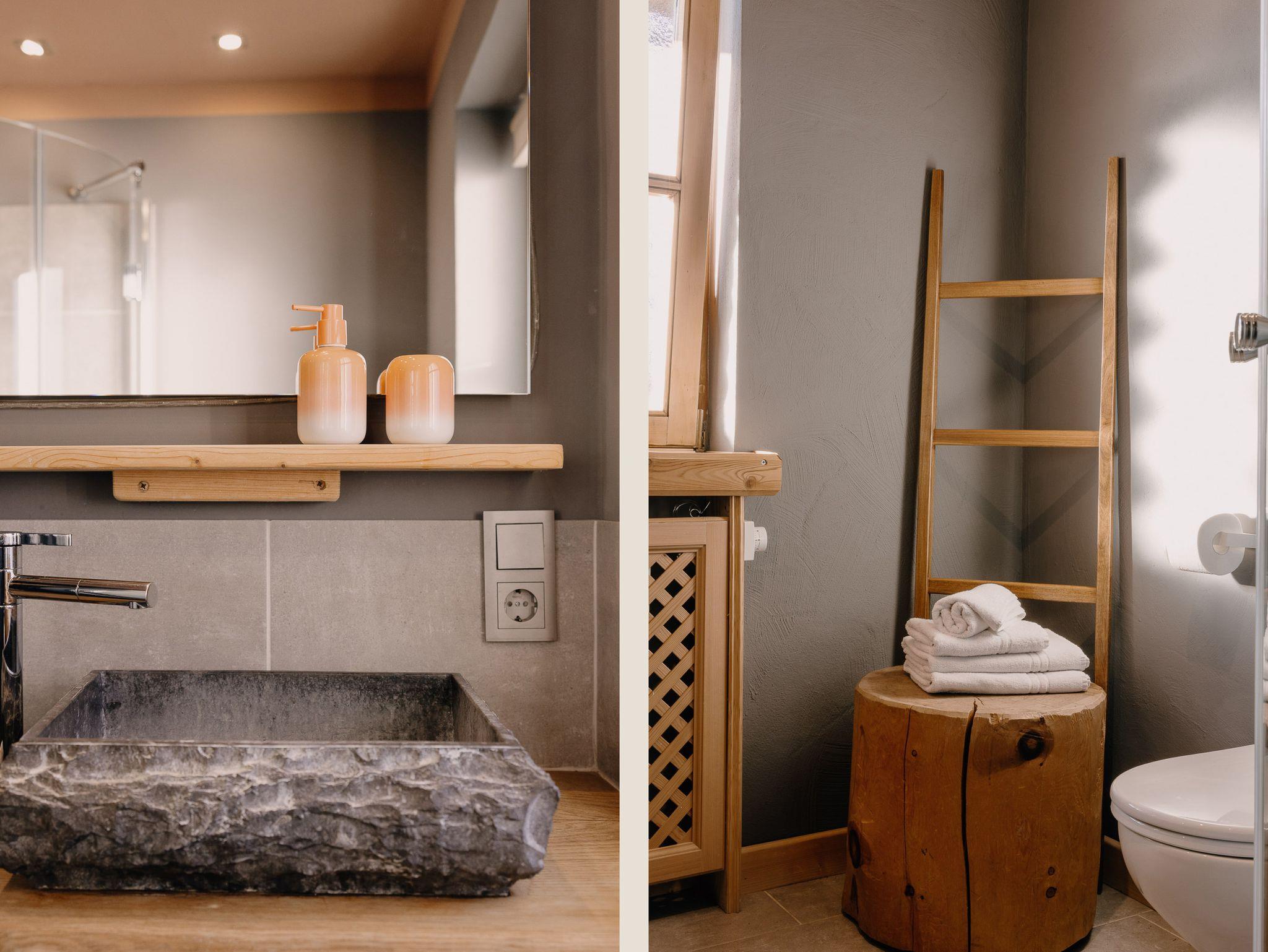 Das Apartment im modern-alpinen Landhausstil besteht aus einem Wohnraum mit altem Bauernschrank, Bauerntisch, Magenta Smart TV und Schlafsofa (160 × 200), einem separaten, gemütlichen Schlafzimmer mit Doppelbett (160 × 200), einer gut ausgestatteten Küchenzeile sowie einem modernen Bad mit Dusche, großem Spiegel und Steinwaschbecken.