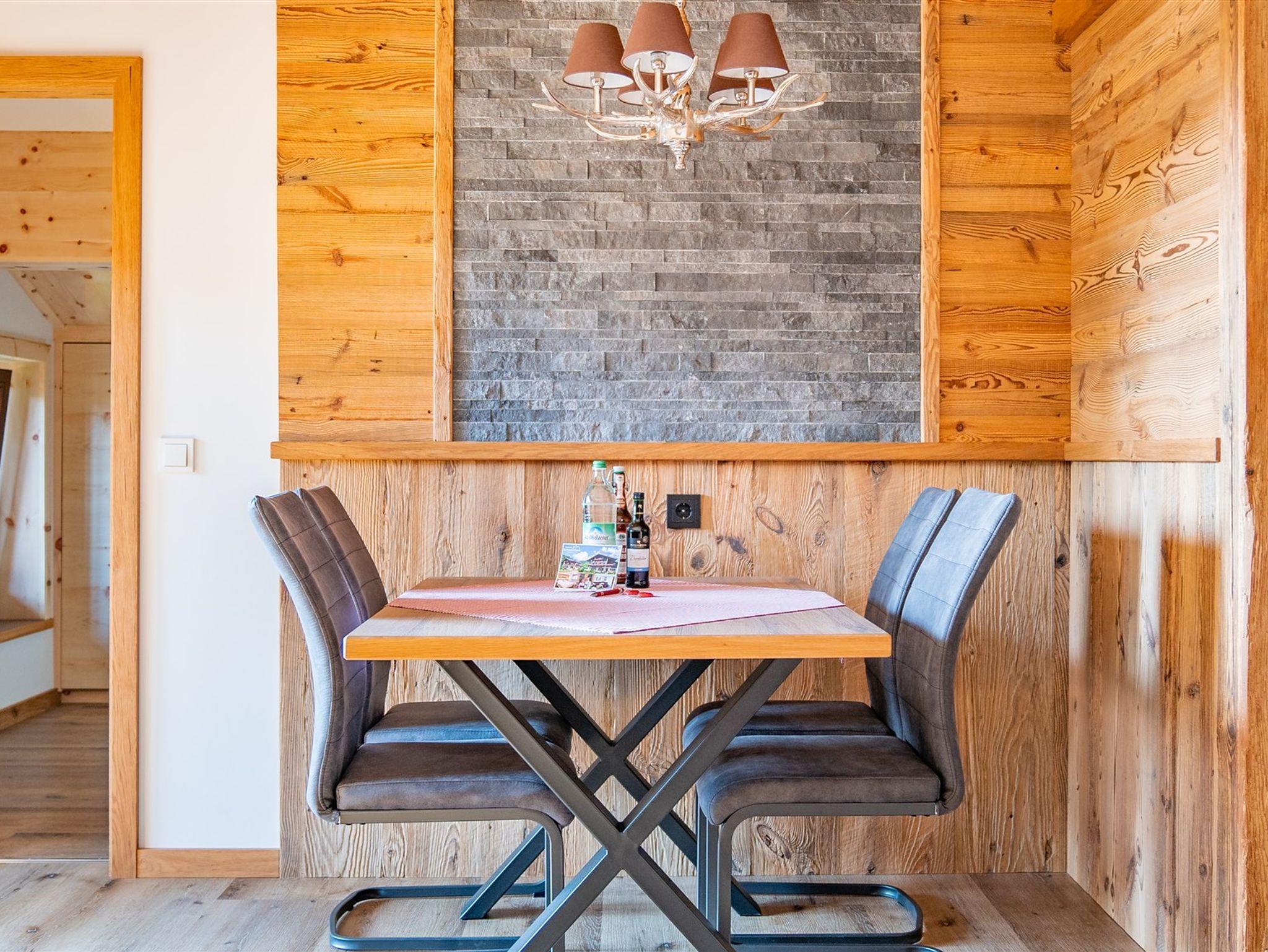 Wohnzimmer bzw. Wohnküche mit komplett ausgestatteter Küchenzeile (Spülmaschine, Backofen usw.), Esstisch mit vier Stühlen, großer Couch, Schlafzimmer mit Holzvertäfelung u. Fichtenmöbeln, großes Bad mit ebenerdiger Dusche und Balkon, buchbar für max. zwei Erwachsene und ein Kind (nur kleine Kinder möglich!).