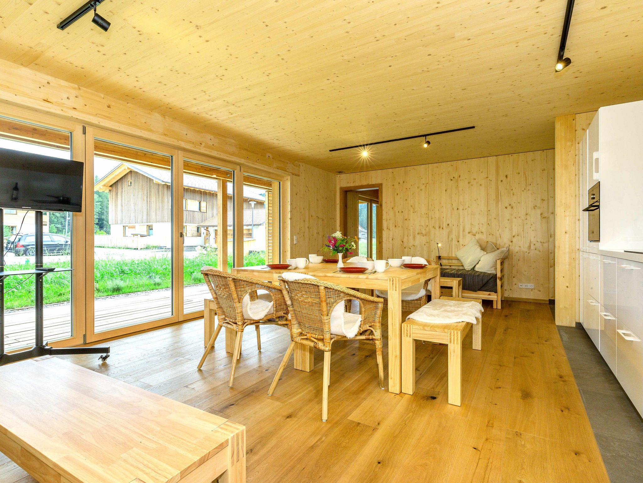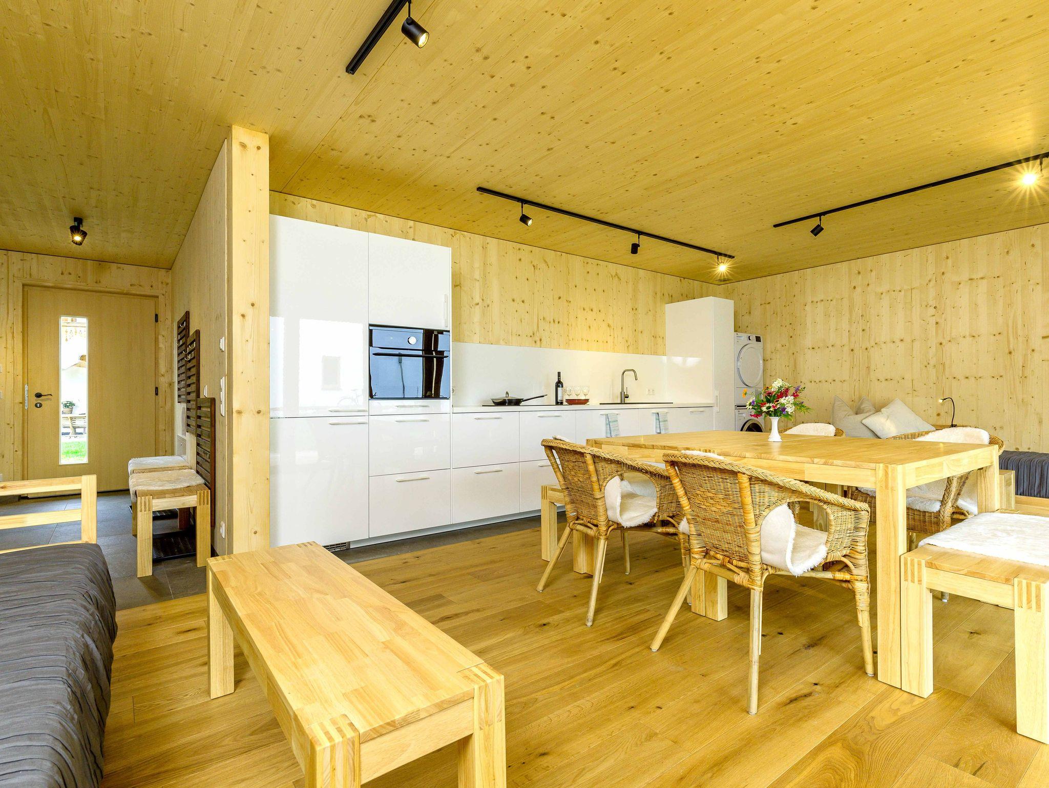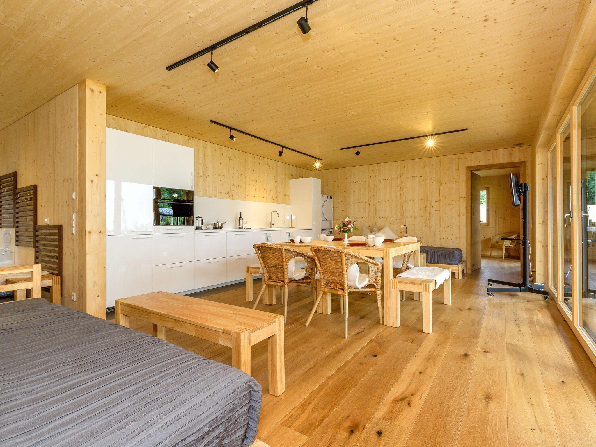 Die große, moderne Küchenzeile ist mit Kühl- und Gefrierschrank, Mikrowelle, Backofen, Spülmaschine, Waschmaschine und Trockner ausgestattet. Des Weiteren verfügt die Wohnung über eine Terrasse und eine Ski-Box, sowie Kabel-TV und kostenloses WLAN mit bis zu 200Mbit/s.