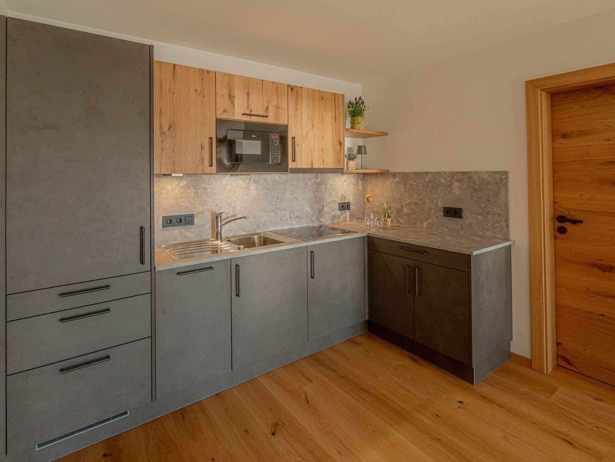 In der voll ausgestatteten Küche mit 4-Platten-Induktionskochfeld, Kühl-/Gefrierkombination, Mikrowelle, Wasserkocher und Toaster finden Sie alles, was Sie für ein schnelles Frühstück oder einen Snack zwischendurch benötigen.